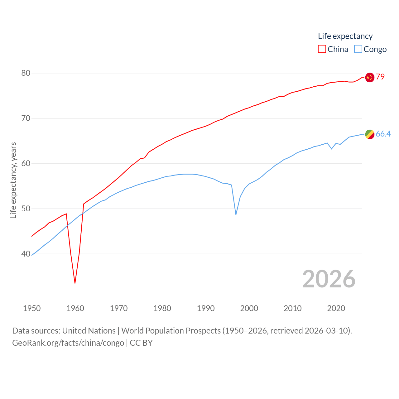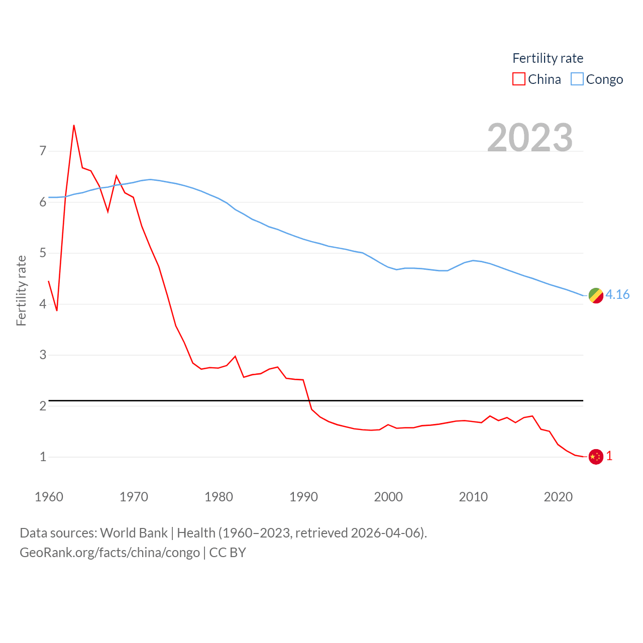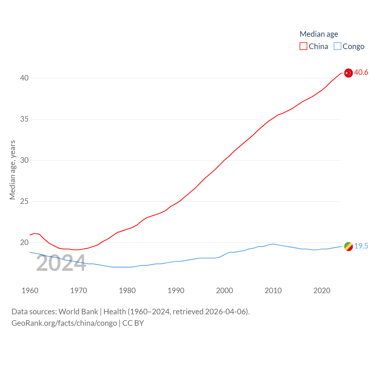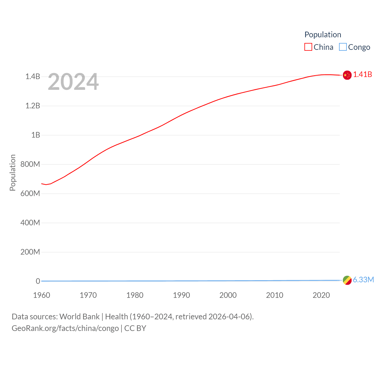 China has a population of 1.41B (ranked 2/197), compared with 6.33M in The Congo (ranked 112/197). China's land area is 3,624,808 sq mi versus 131,854 sq mi for The Congo (ranked 2nd vs. 64th).
