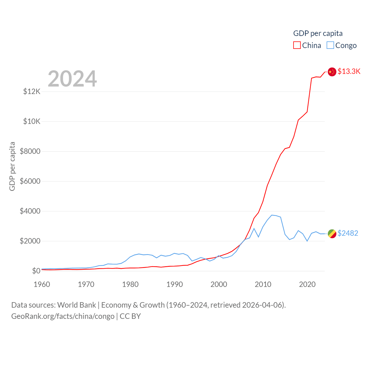 By GDP, China ranks 2/197 ($18.7T) and The Congo ranks 141/197 ($15.7B). By GDP per capita, China ranks 76/197 ($13,303), while The Congo ranks 149/197 ($2,482).