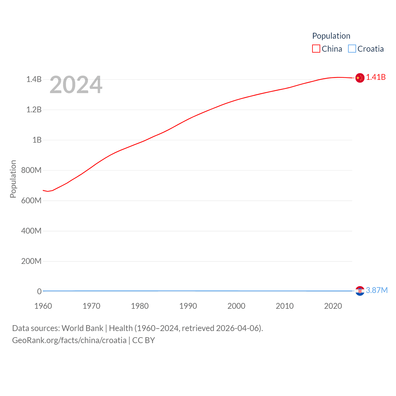 China has a population of 1.41B (ranked 2/197), compared with 3.87M in Croatia (ranked 129/197). China's land area is 3,624,808 sq mi versus 21,606 sq mi for Croatia (ranked 2nd vs. 123rd).