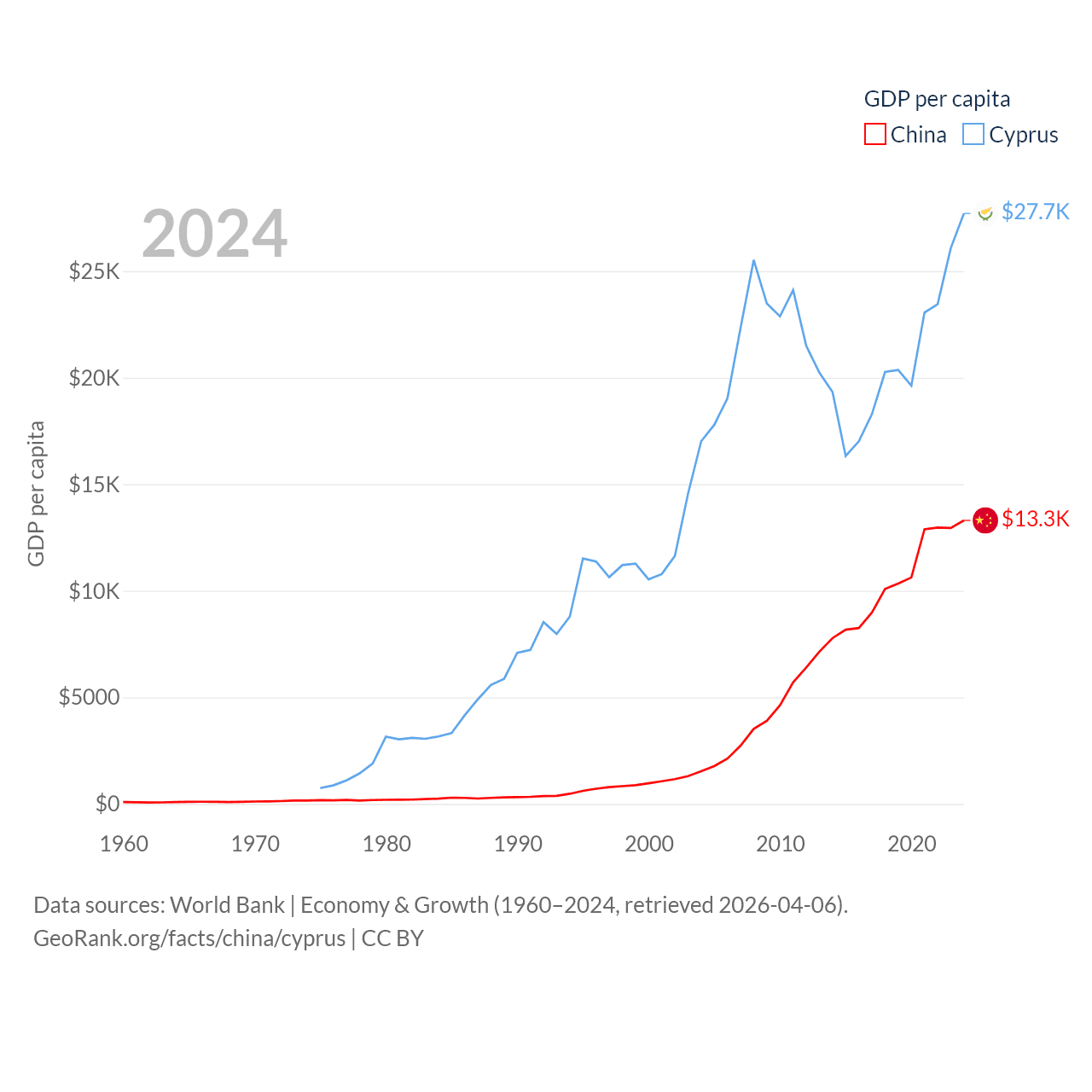 By GDP, China ranks 2/197 ($18.7T) and Cyprus ranks 103/197 ($37.6B). By GDP per capita, China ranks 76/197 ($13,303), while Cyprus ranks 45/197 ($27,707).