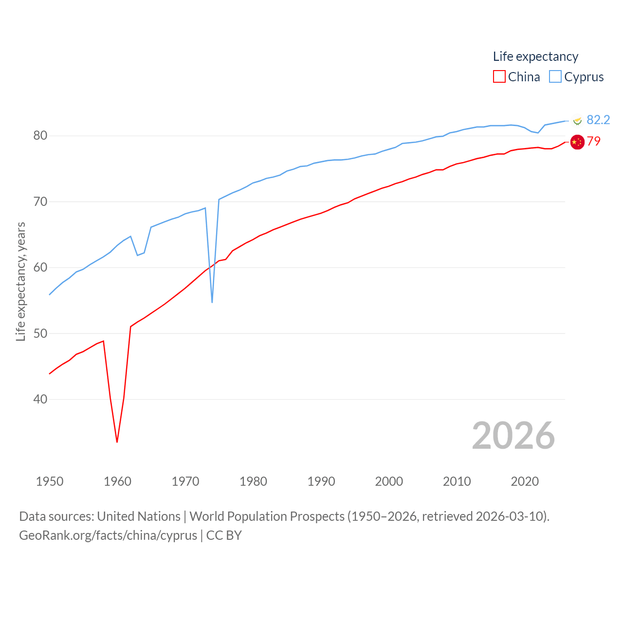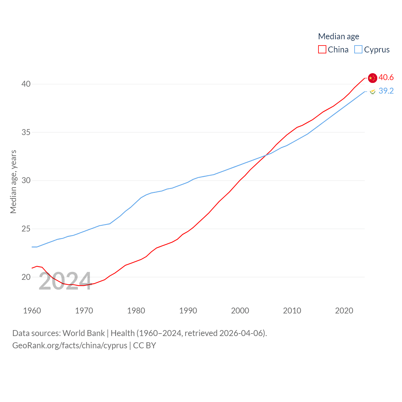 China has a population of 1.41B (ranked 2/197), compared with 1.36M in Cyprus (ranked 155/197). China's land area is 3,624,808 sq mi versus 3,568 sq mi for Cyprus (ranked 2nd vs. 163rd).