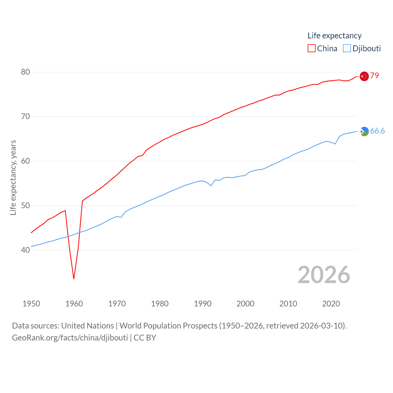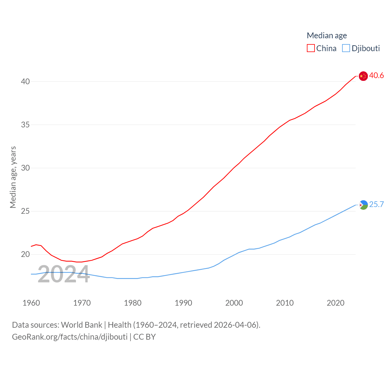 China has a population of 1.41B (ranked 2/197), compared with 1.17M in Djibouti (ranked 158/197). China's land area is 3,624,808 sq mi versus 8,950 sq mi for Djibouti (ranked 2nd vs. 147th).