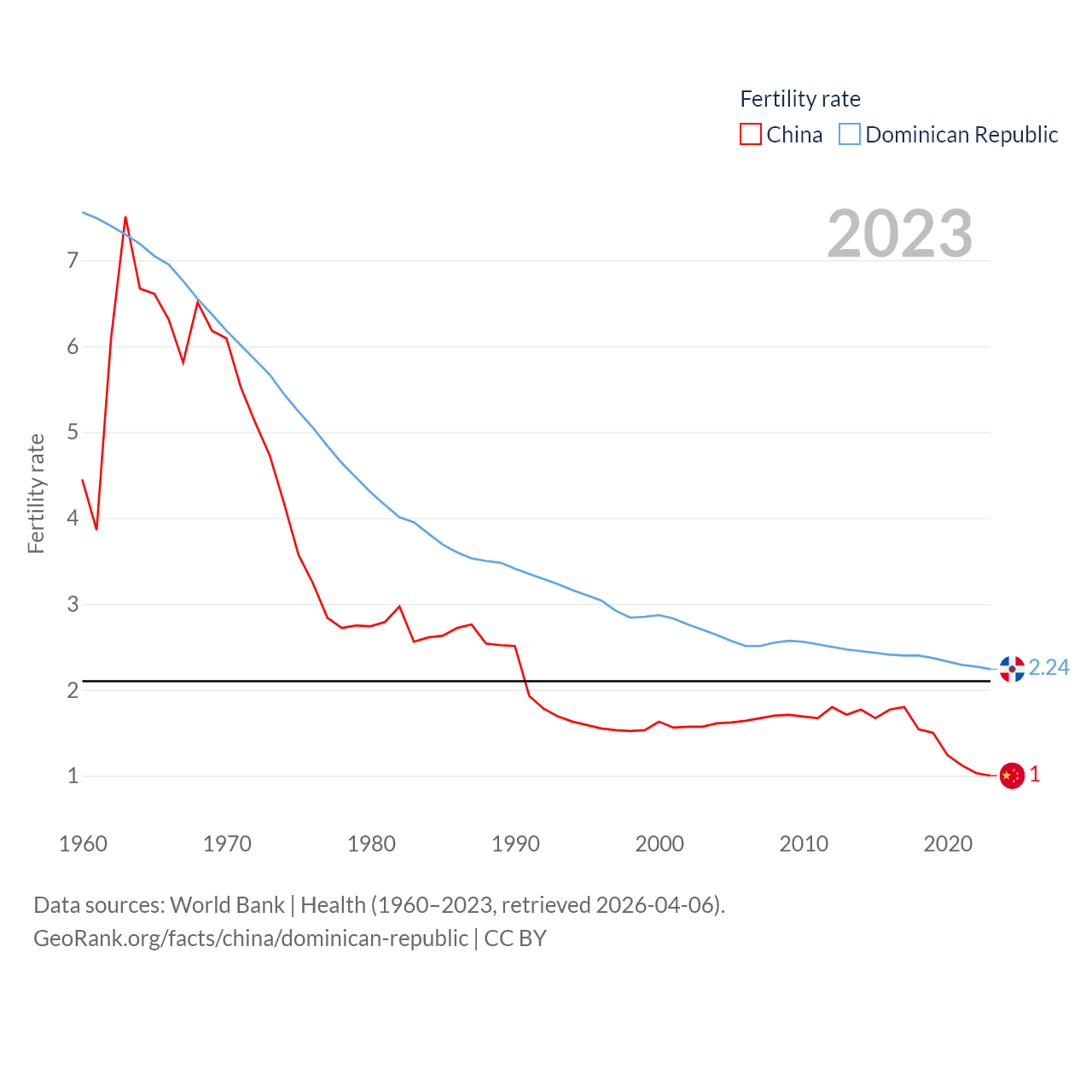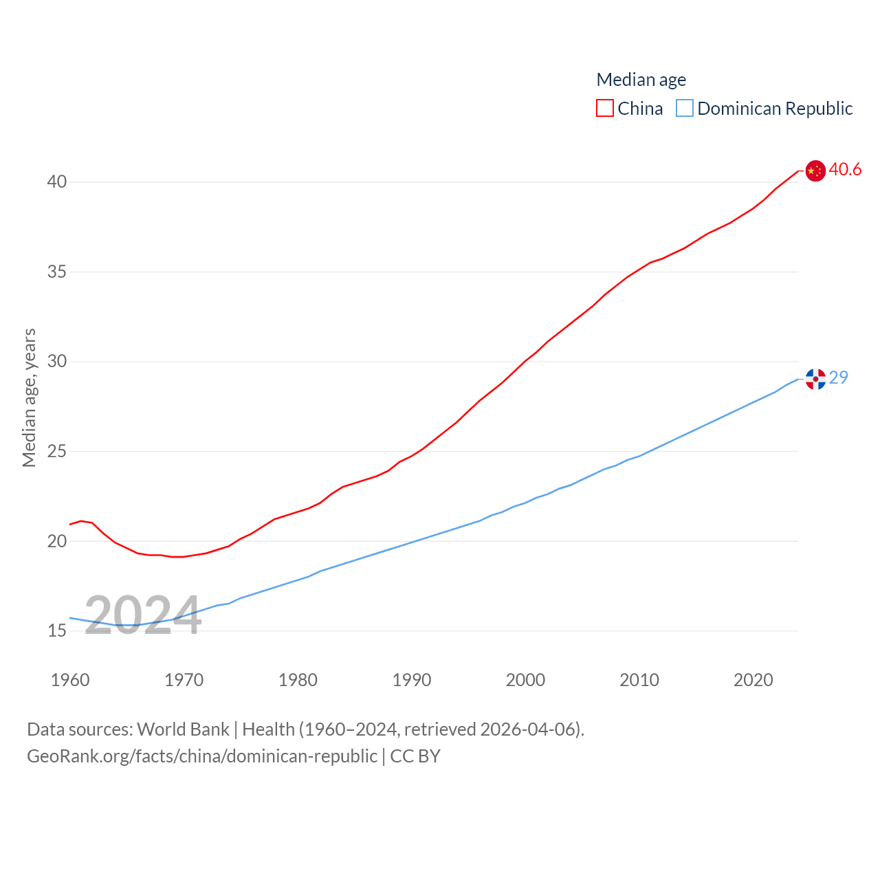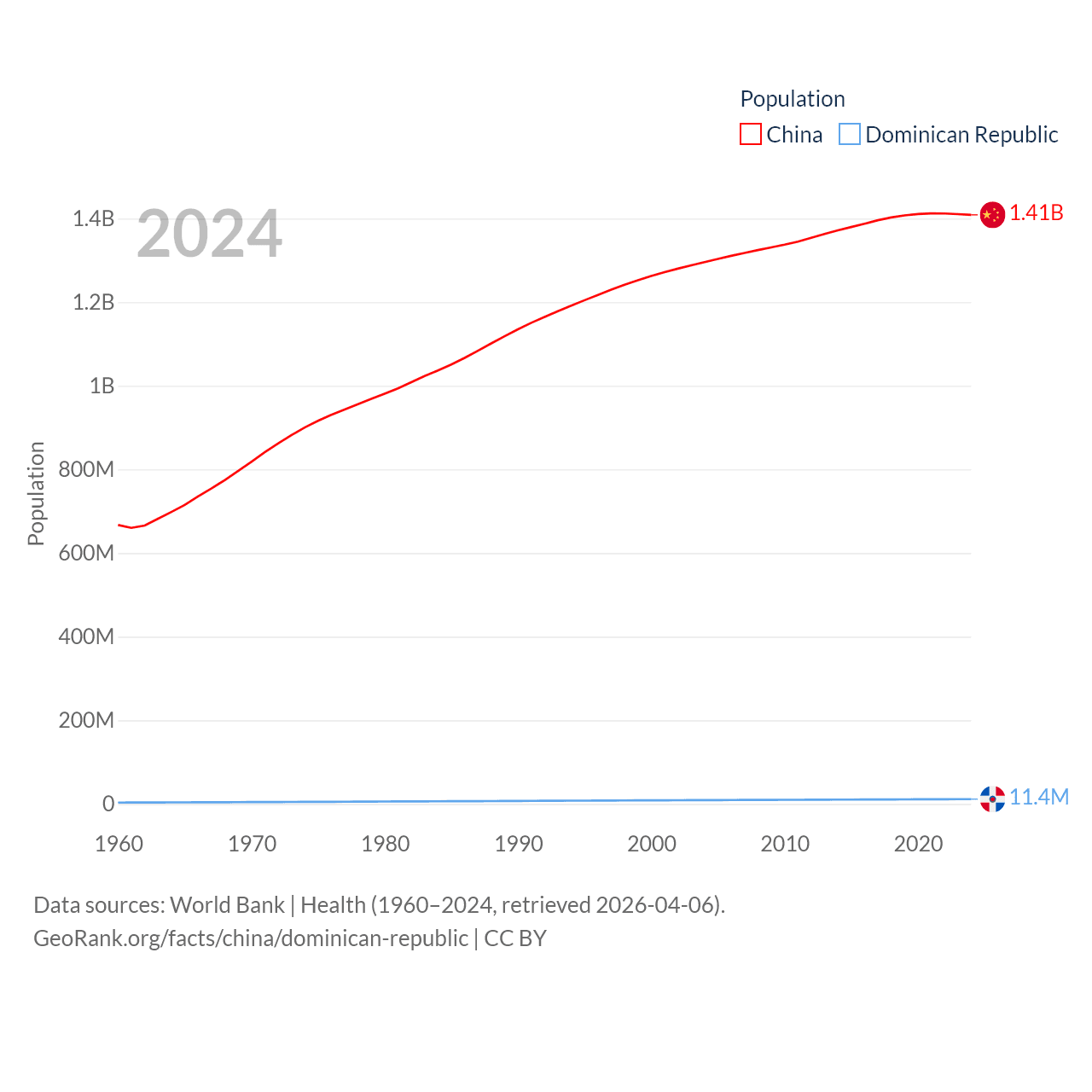 China has a population of 1.41B (ranked 2/197), compared with 11.4M in The Dominican Republic (ranked 85/197). China's land area is 3,624,808 sq mi versus 18,609 sq mi for The Dominican Republic (ranked 2nd vs. 127th).