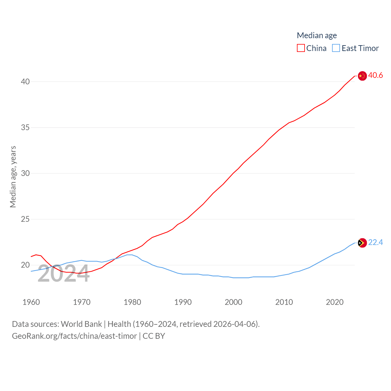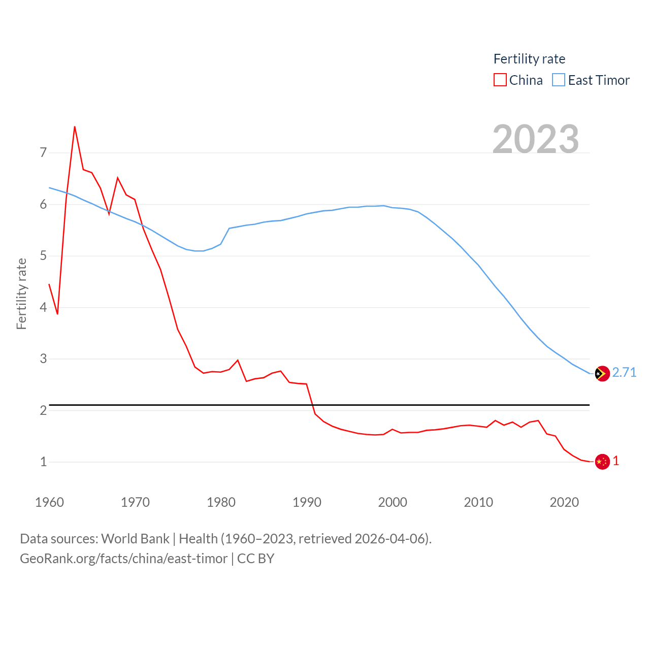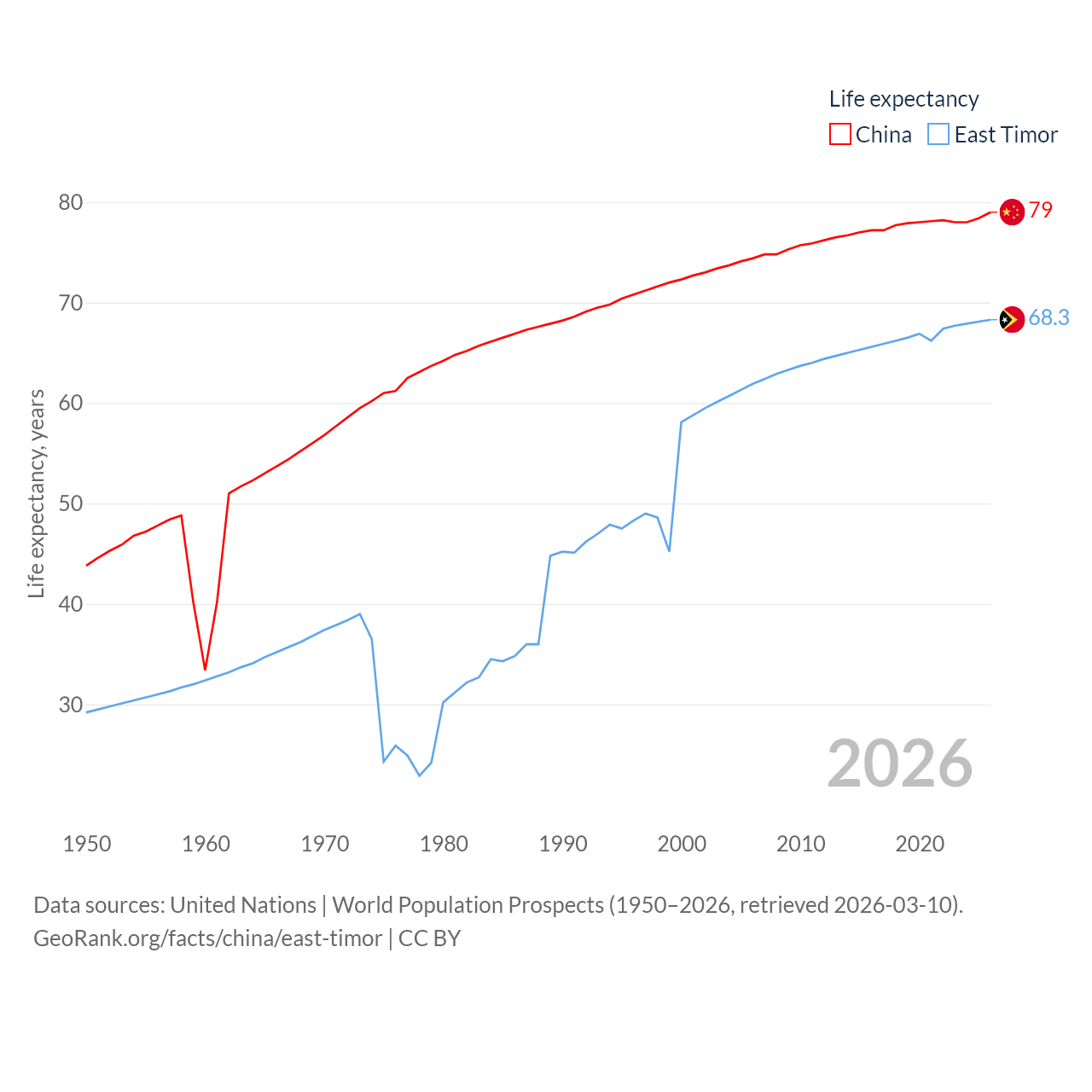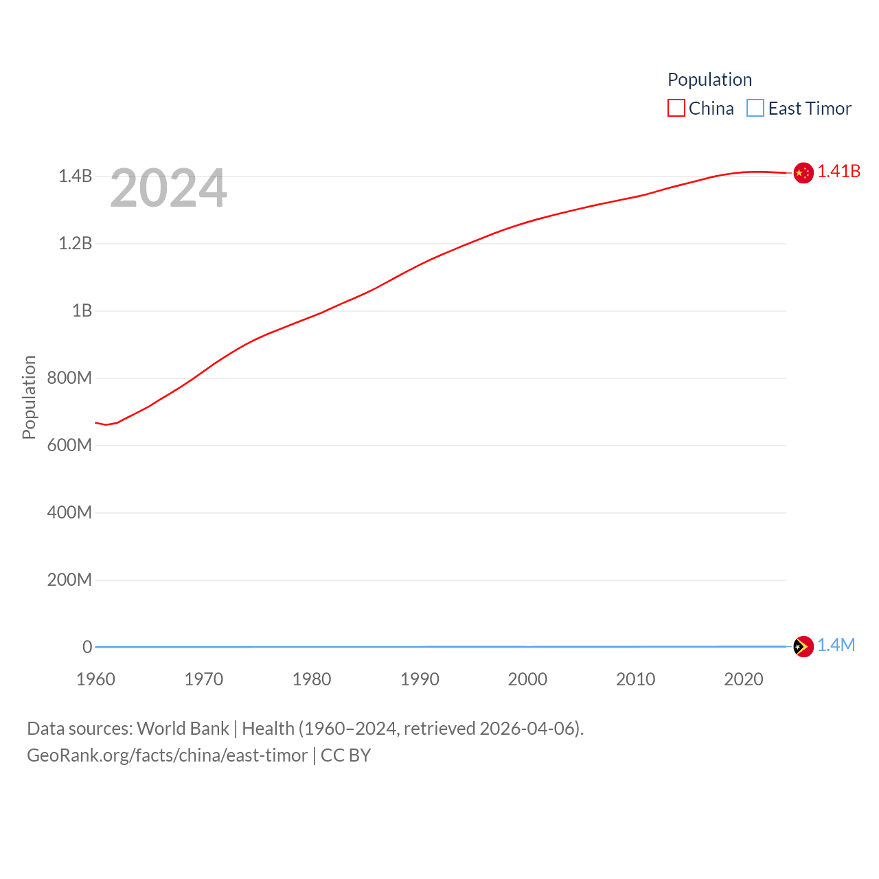 China has a population of 1.41B (ranked 2/197), compared with 1.4M in East Timor (ranked 152/197). China's land area is 3,624,808 sq mi versus 5,741 sq mi for East Timor (ranked 2nd vs. 155th).