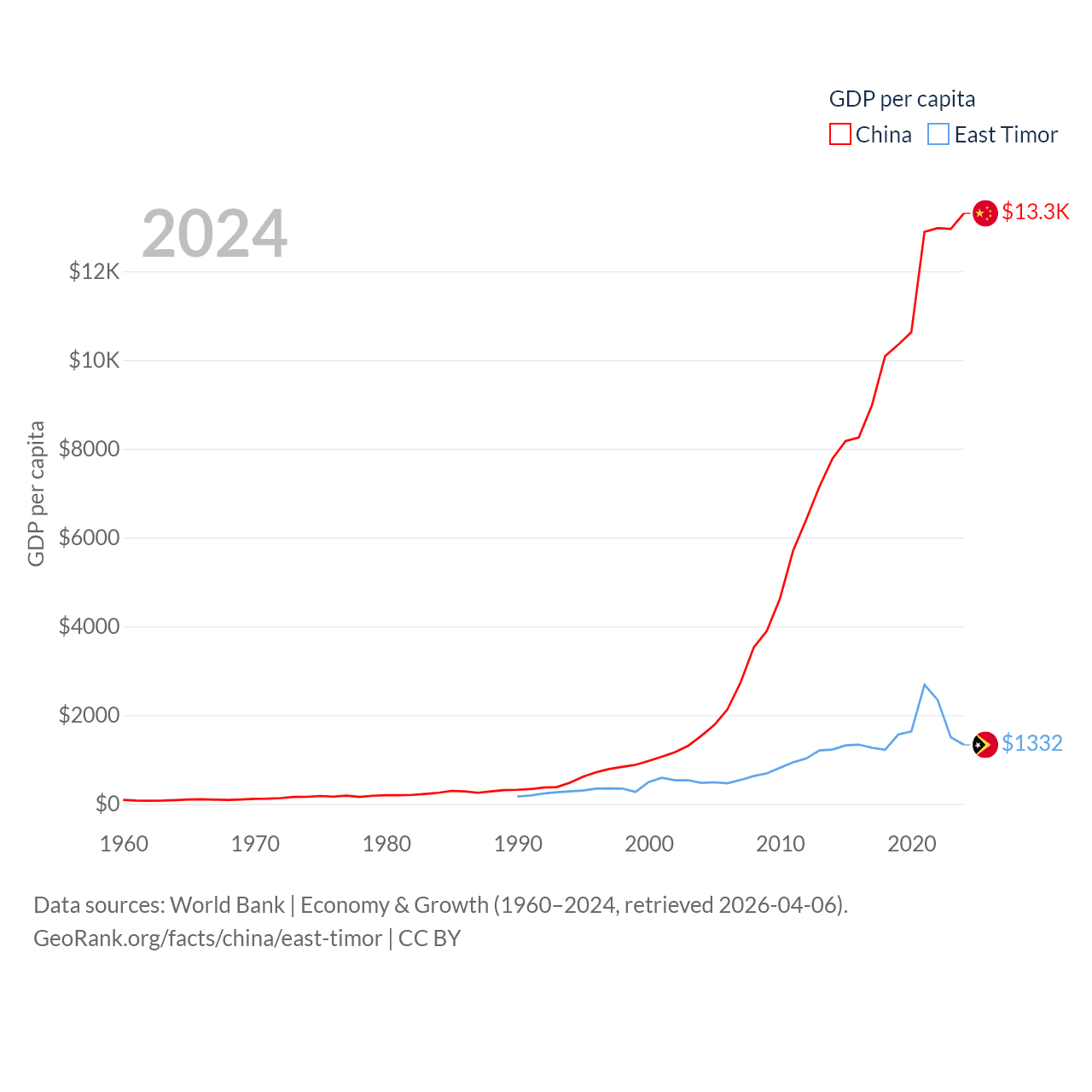 By GDP, China ranks 2/197 ($18.7T) and East Timor ranks 181/197 ($1.87B). By GDP per capita, China ranks 76/197 ($13,303), while East Timor ranks 167/197 ($1,332).