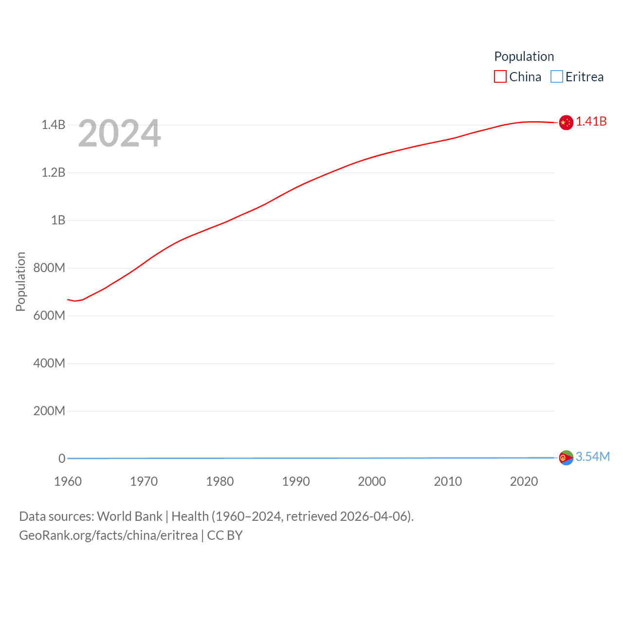 China has a population of 1.41B (ranked 2/197), compared with 3.54M in Eritrea (ranked 131/197). China's land area is 3,624,808 sq mi versus 46,787 sq mi for Eritrea (ranked 2nd vs. 96th).
