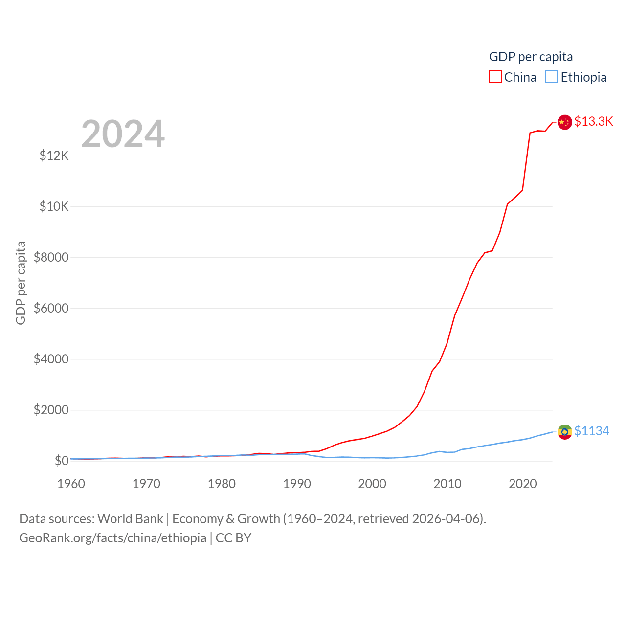 By GDP, China ranks 2/197 ($18.7T) and Ethiopia ranks 60/197 ($150B). By GDP per capita, China ranks 76/197 ($13,303), while Ethiopia ranks 171/197 ($1,134).