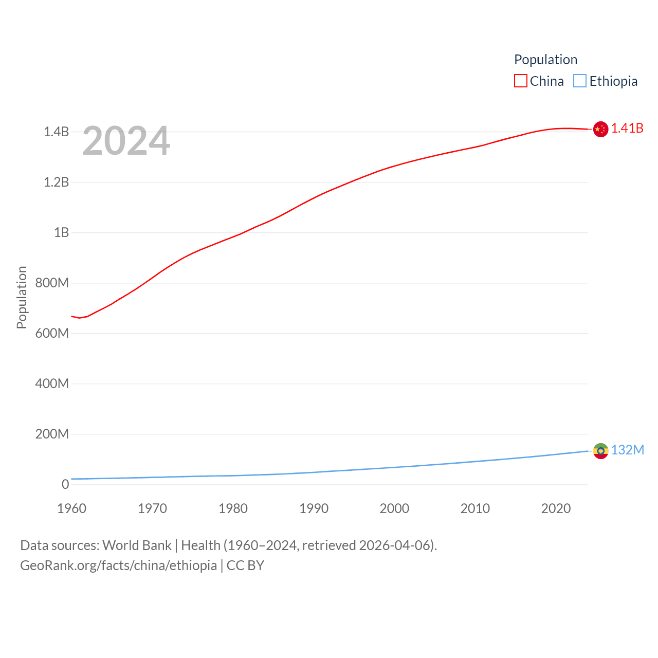 China has a population of 1.41B (ranked 2/197), compared with 132M in Ethiopia (ranked 10/197). China's land area is 3,624,808 sq mi versus 435,716 sq mi for Ethiopia (ranked 2nd vs. 25th).