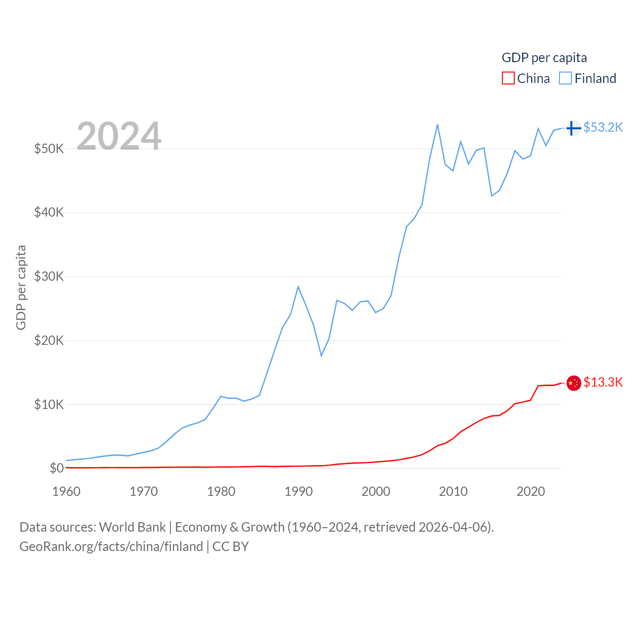 By GDP, China ranks 2/197 ($18.7T) and Finland ranks 47/197 ($299B). By GDP per capita, China ranks 76/197 ($13,303), while Finland ranks 23/197 ($53,150).