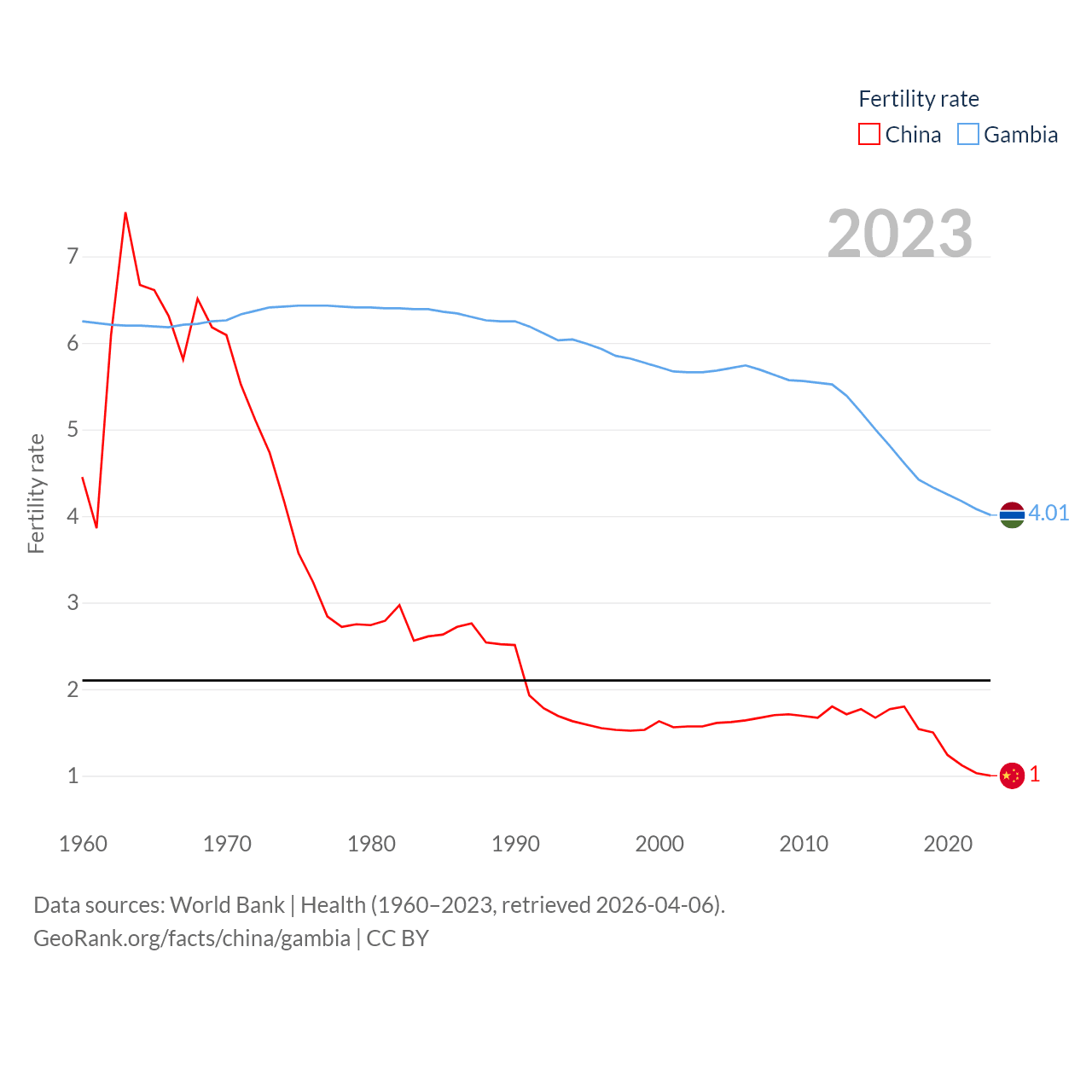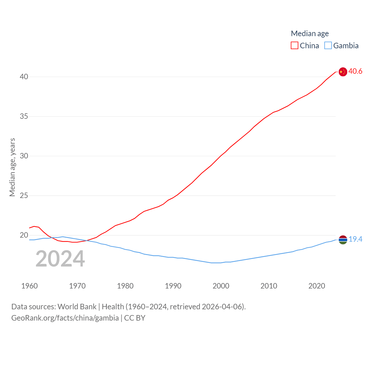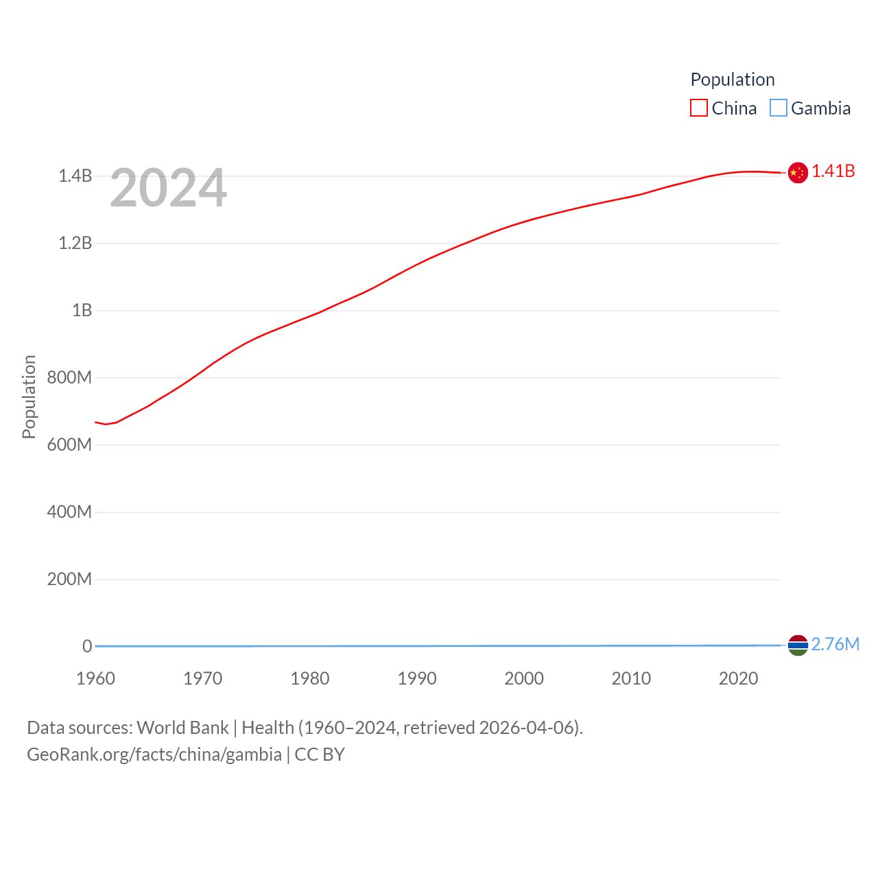 China has a population of 1.41B (ranked 2/197), compared with 2.76M in The Gambia (ranked 140/197). China's land area is 3,624,808 sq mi versus 3,907 sq mi for The Gambia (ranked 2nd vs. 161st).