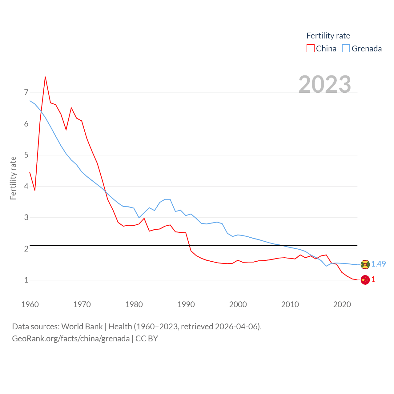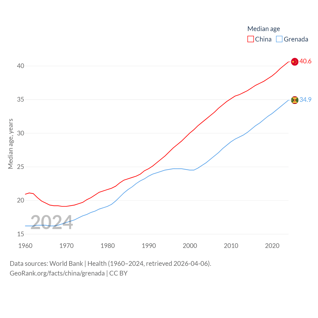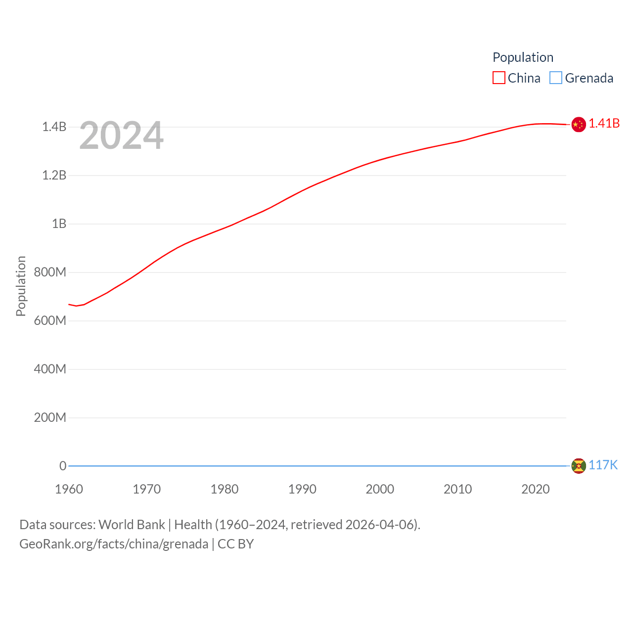 China has a population of 1.41B (ranked 2/197), compared with 117K in Grenada (ranked 182/197). China's land area is 3,624,808 sq mi versus 131.3 sq mi for Grenada (ranked 2nd vs. 186th).