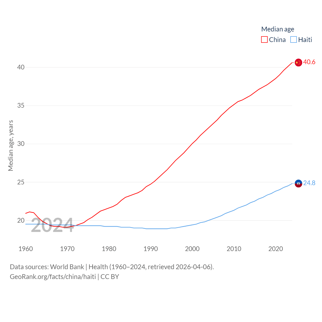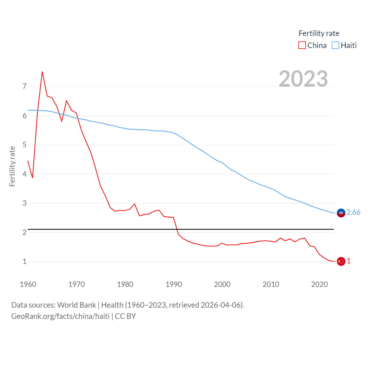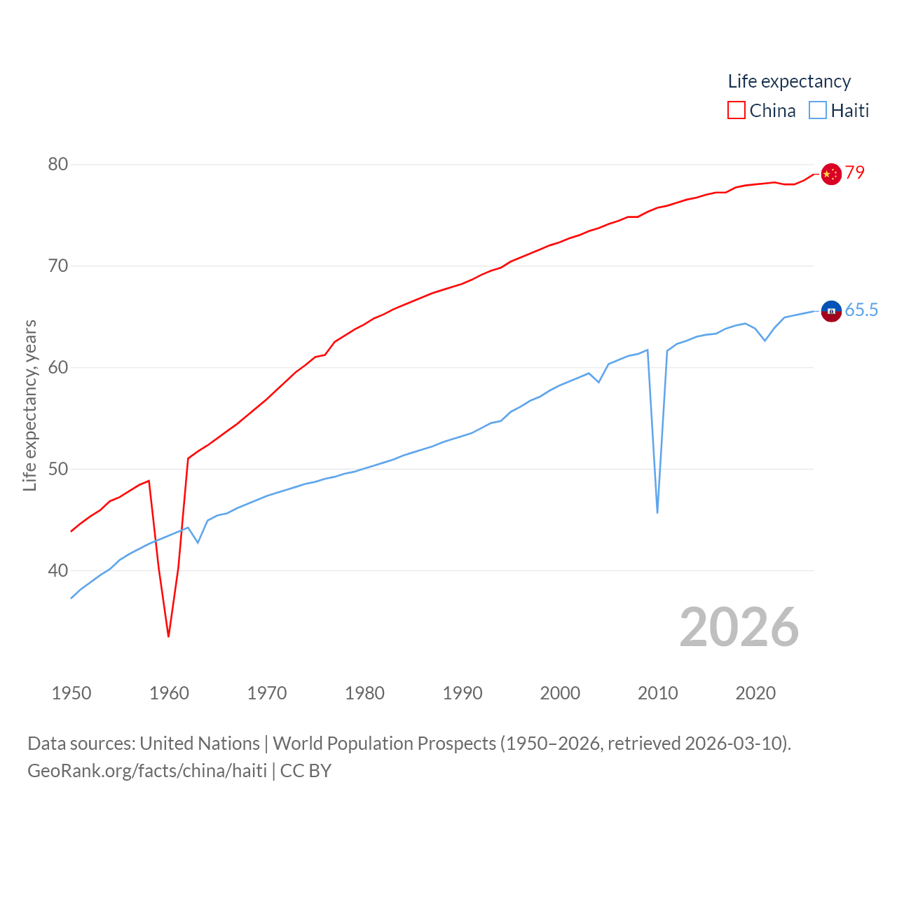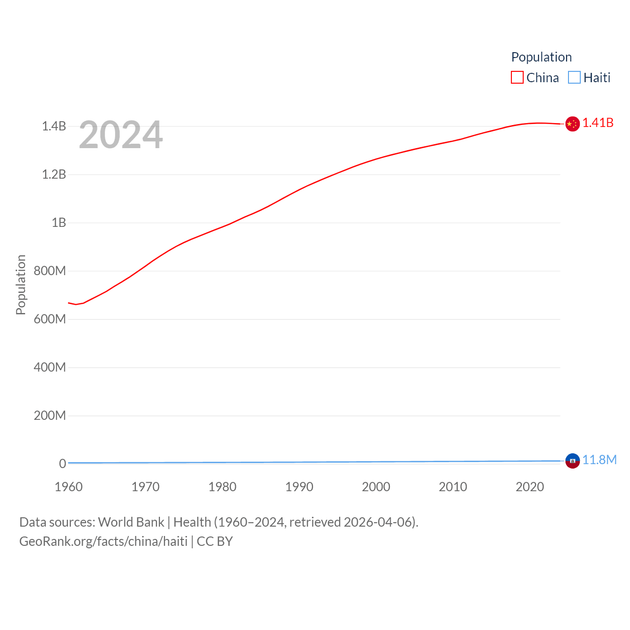 China has a population of 1.41B (ranked 2/197), compared with 11.8M in Haiti (ranked 83/197). China's land area is 3,624,808 sq mi versus 10,641 sq mi for Haiti (ranked 2nd vs. 142nd).