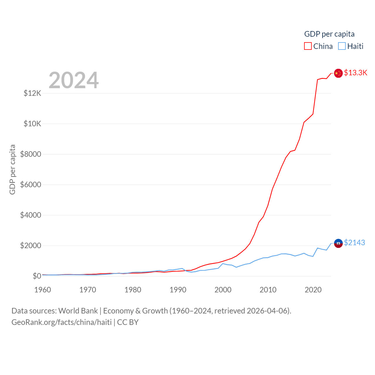 By GDP, China ranks 2/197 ($18.7T) and Haiti ranks 117/197 ($25.2B). By GDP per capita, China ranks 76/197 ($13,303), while Haiti ranks 153/197 ($2,143).