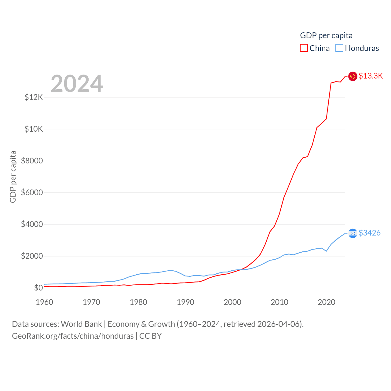 By GDP, China ranks 2/197 ($18.7T) and Honduras ranks 104/197 ($37.1B). By GDP per capita, China ranks 76/197 ($13,303), while Honduras ranks 136/197 ($3,426).