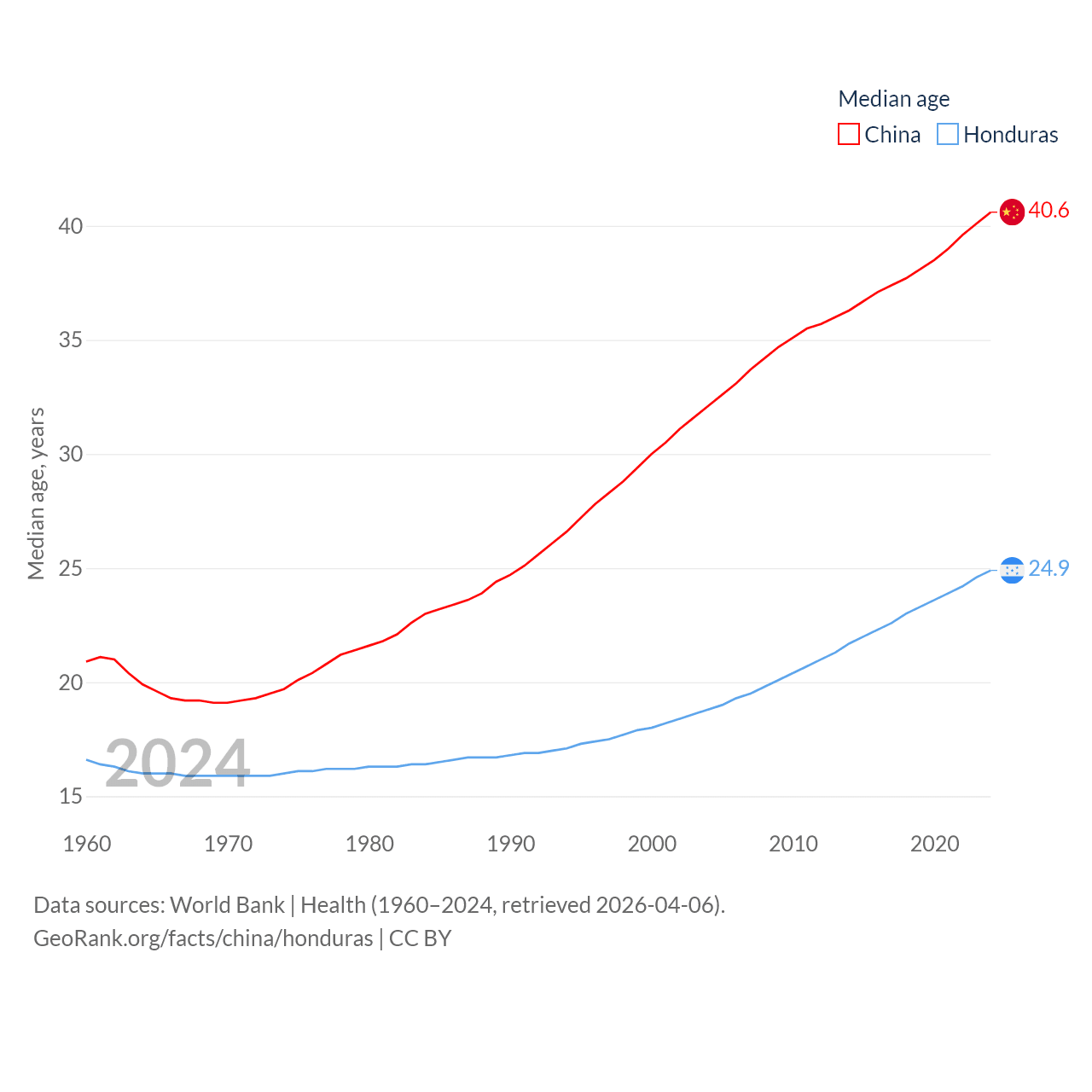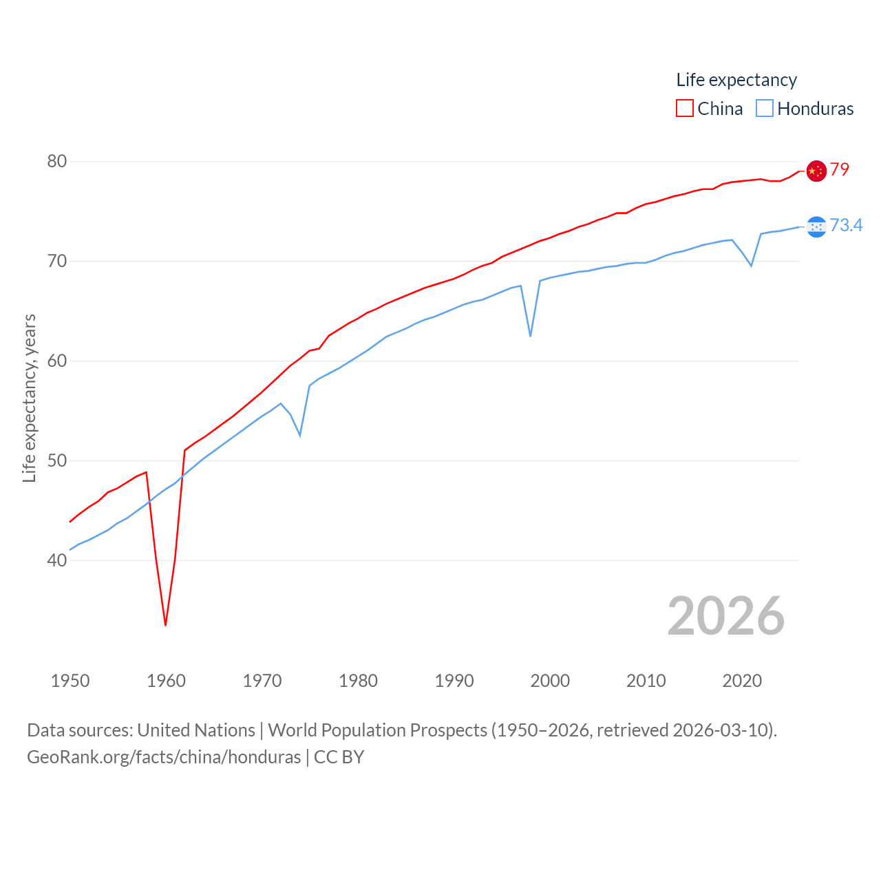 China has a population of 1.41B (ranked 2/197), compared with 10.8M in Honduras (ranked 89/197). China's land area is 3,624,808 sq mi versus 43,201 sq mi for Honduras (ranked 2nd vs. 100th).