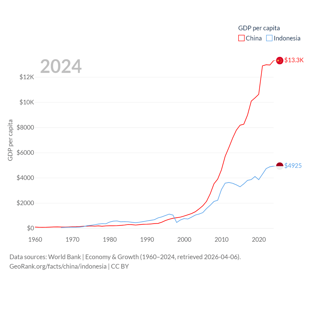 By GDP, China ranks 2/197 ($18.7T) and Indonesia ranks 16/197 ($1.4T). By GDP per capita, China ranks 76/197 ($13,303), while Indonesia ranks 121/197 ($4,925).