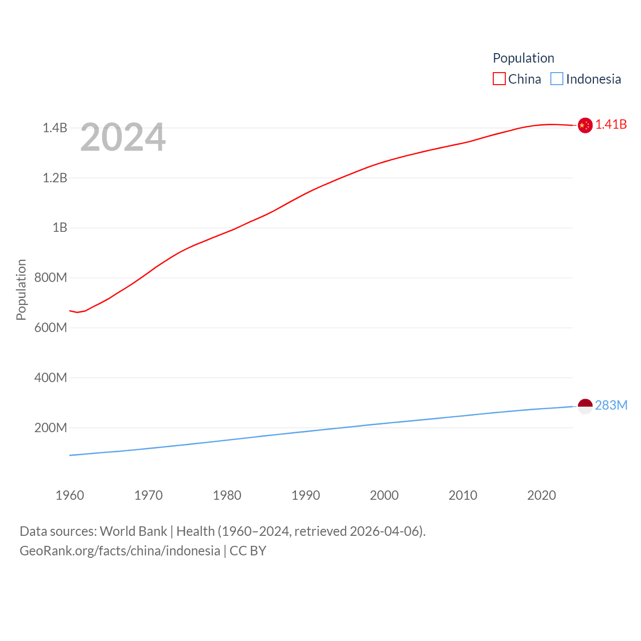China has a population of 1.41B (ranked 2/197), compared with 283M in Indonesia (ranked 4/197). China's land area is 3,624,808 sq mi versus 730,720 sq mi for Indonesia (ranked 2nd vs. 14th).