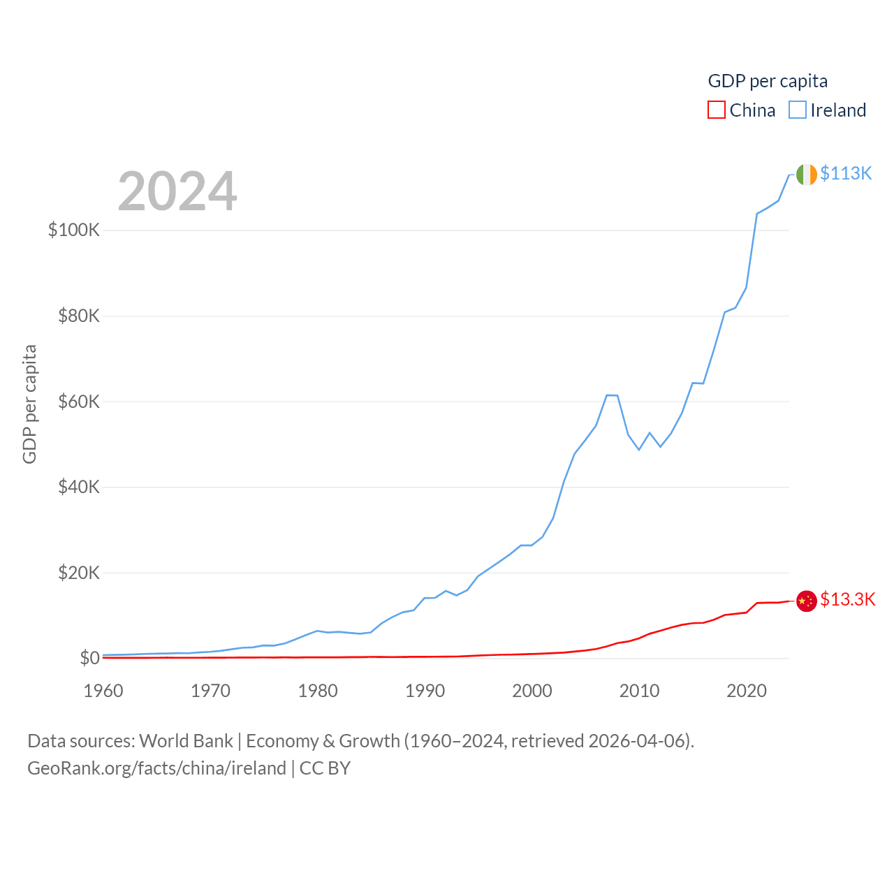 By GDP, China ranks 2/197 ($18.7T) and Ireland ranks 25/197 ($609B). By GDP per capita, China ranks 76/197 ($13,303), while Ireland ranks 4/197 ($112,895).