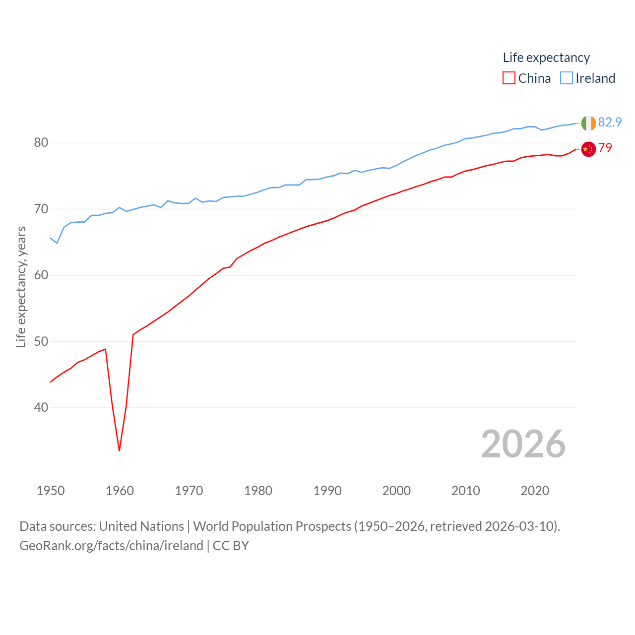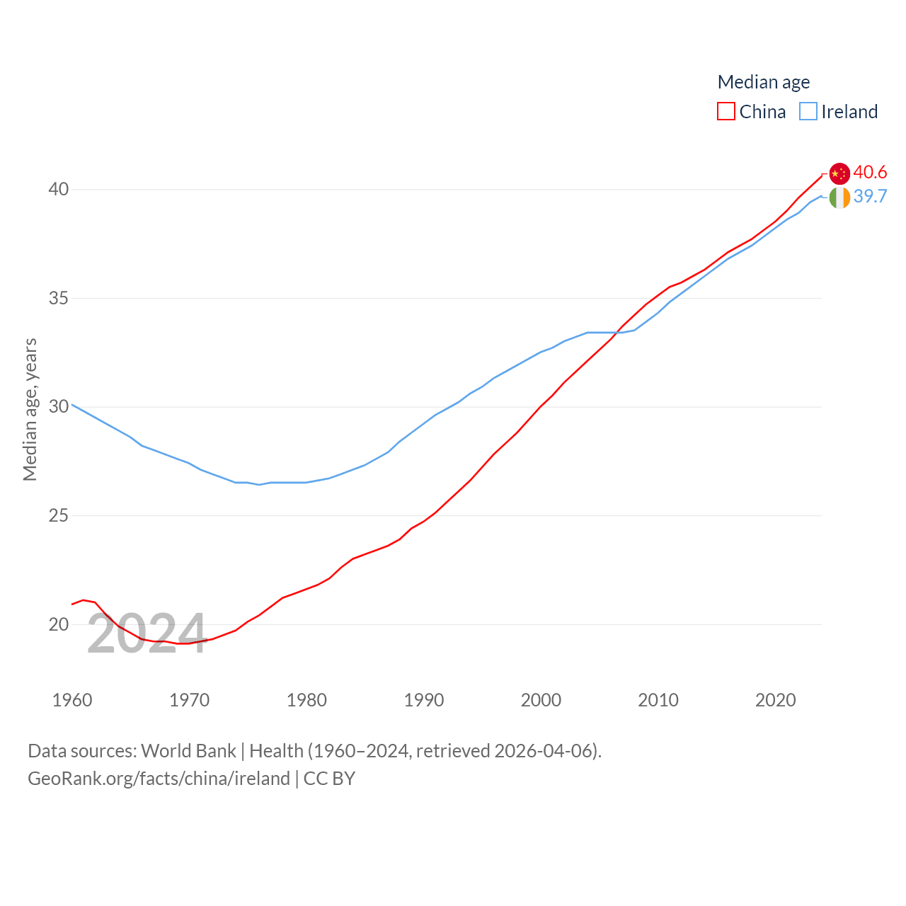 China has a population of 1.41B (ranked 2/197), compared with 5.4M in Ireland (ranked 120/197). China's land area is 3,624,808 sq mi versus 26,599 sq mi for Ireland (ranked 2nd vs. 119th).