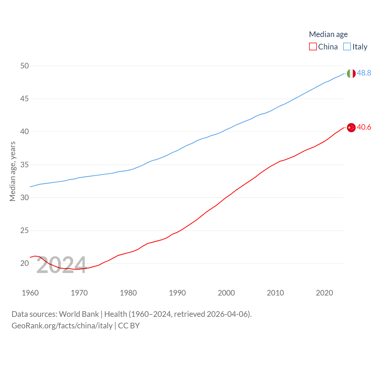 China has a population of 1.41B (ranked 2/197), compared with 59M in Italy (ranked 25/197). China's land area is 3,624,808 sq mi versus 114,178 sq mi for Italy (ranked 2nd vs. 72nd).