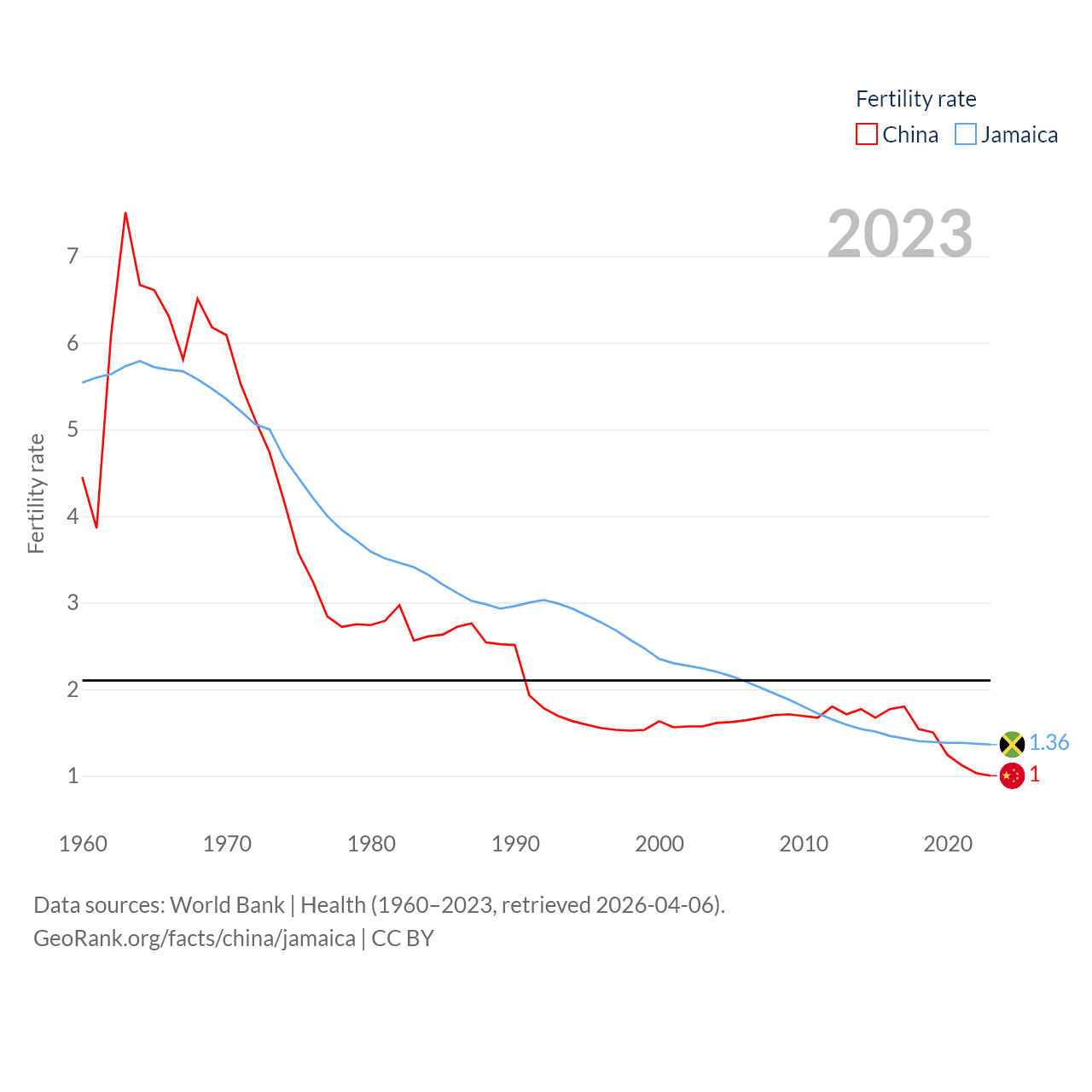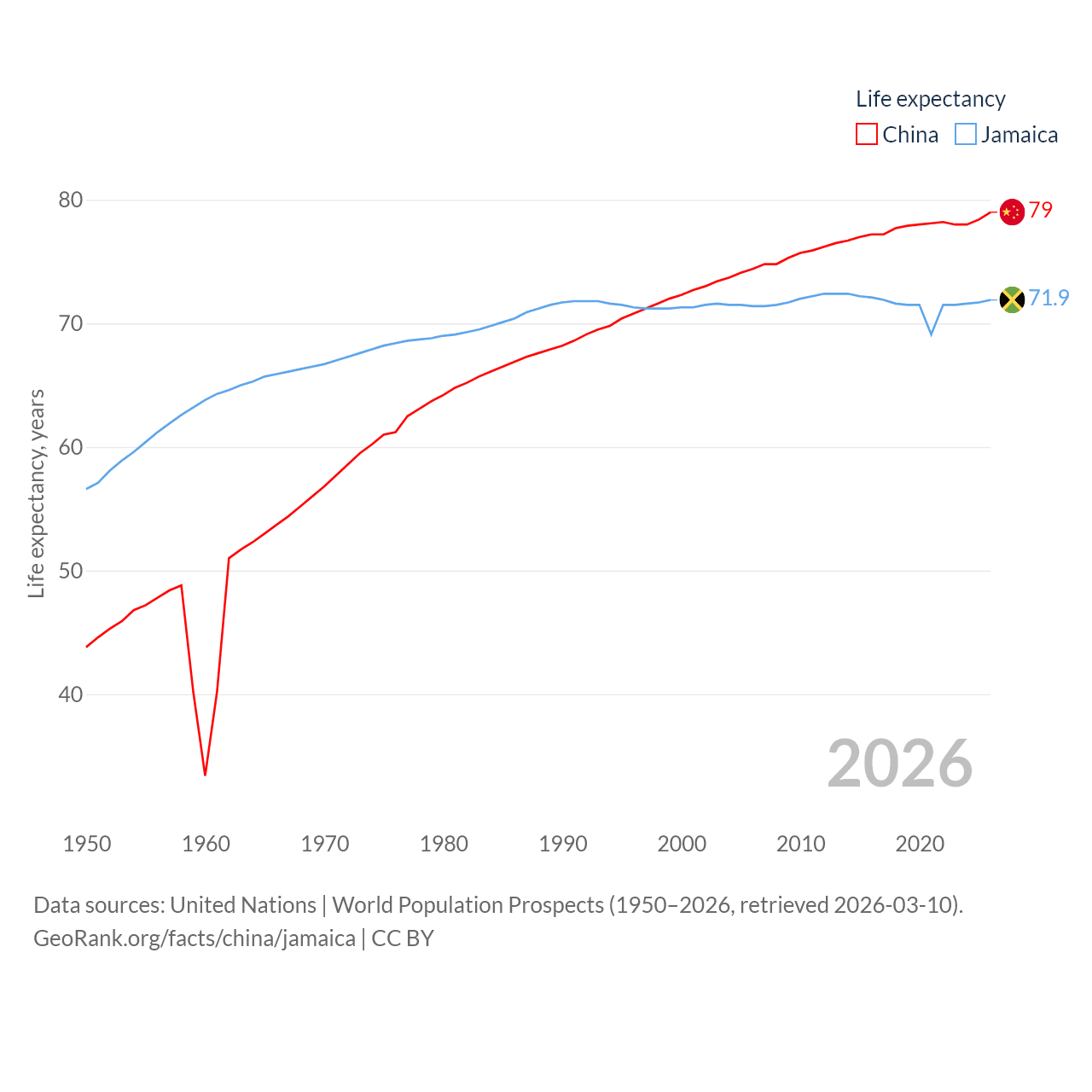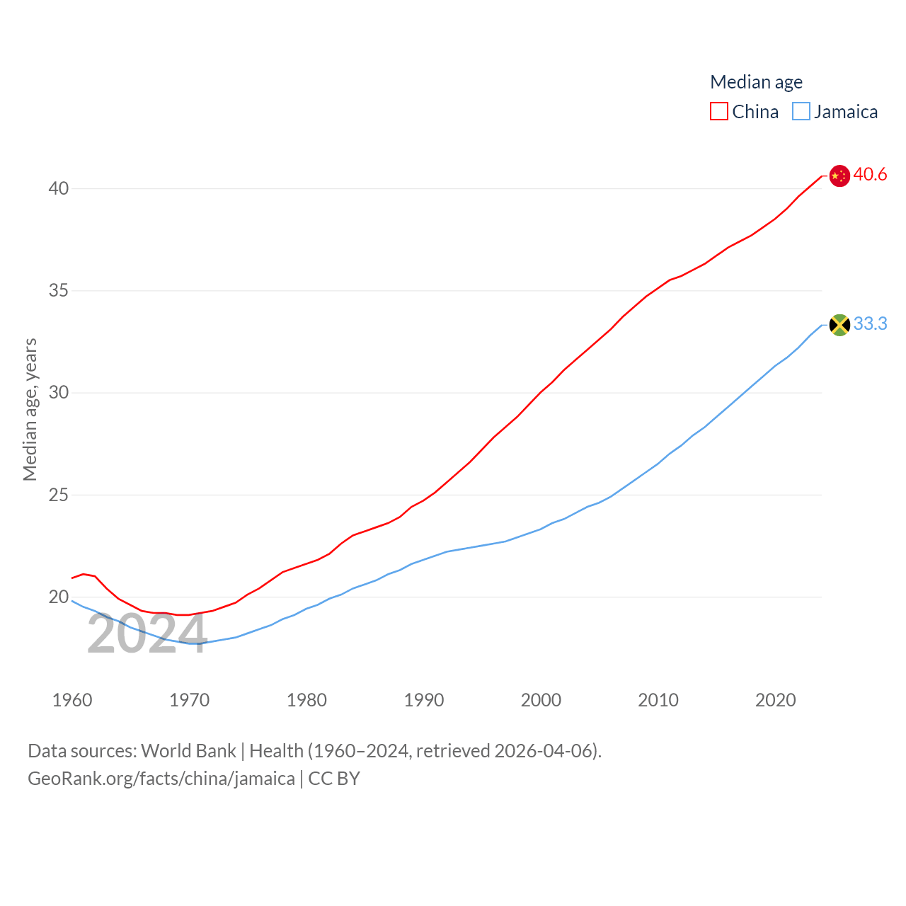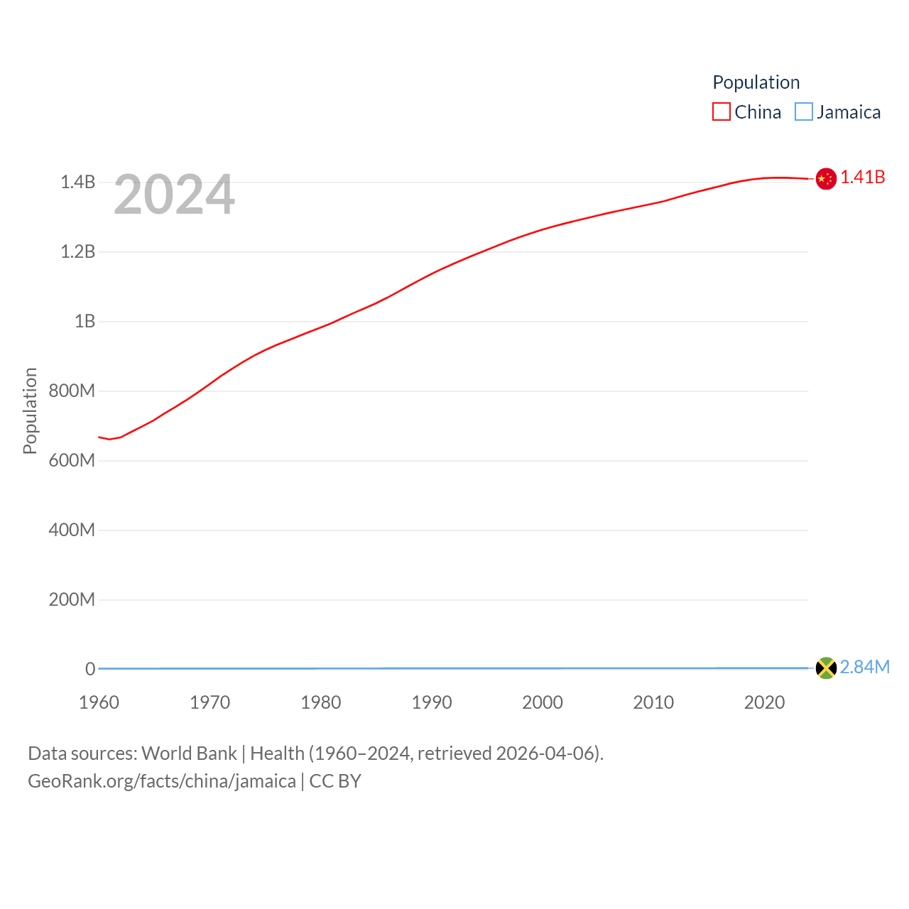 China has a population of 1.41B (ranked 2/197), compared with 2.84M in Jamaica (ranked 139/197). China's land area is 3,624,808 sq mi versus 4,181 sq mi for Jamaica (ranked 2nd vs. 159th).