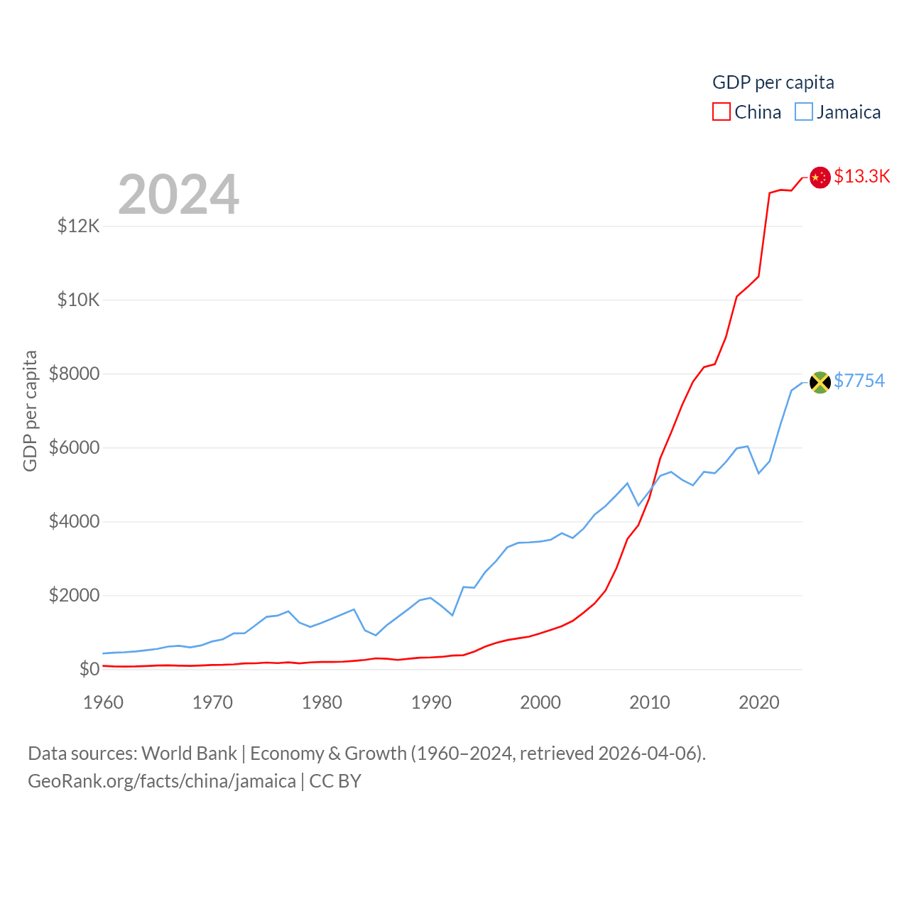 By GDP, China ranks 2/197 ($18.7T) and Jamaica ranks 124/197 ($22B). By GDP per capita, China ranks 76/197 ($13,303), while Jamaica ranks 95/197 ($7,754).