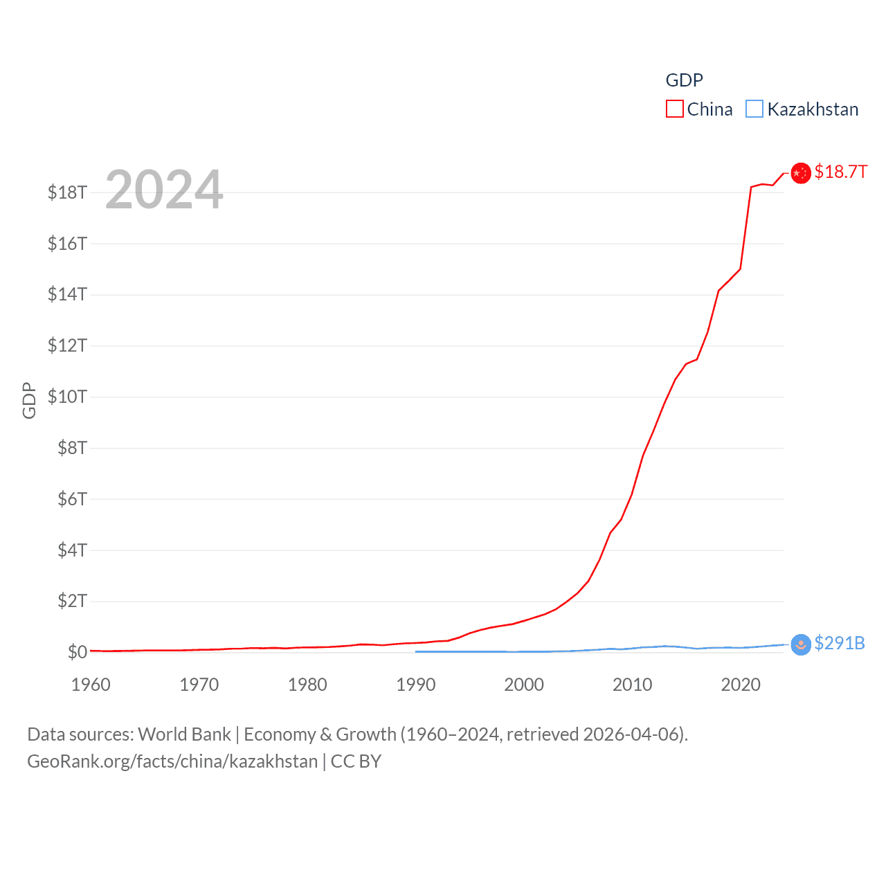 By GDP, China ranks 2/197 ($18.7T) and Kazakhstan ranks 48/197 ($291B). By GDP per capita, China ranks 76/197 ($13,303), while Kazakhstan ranks 71/197 ($14,155).