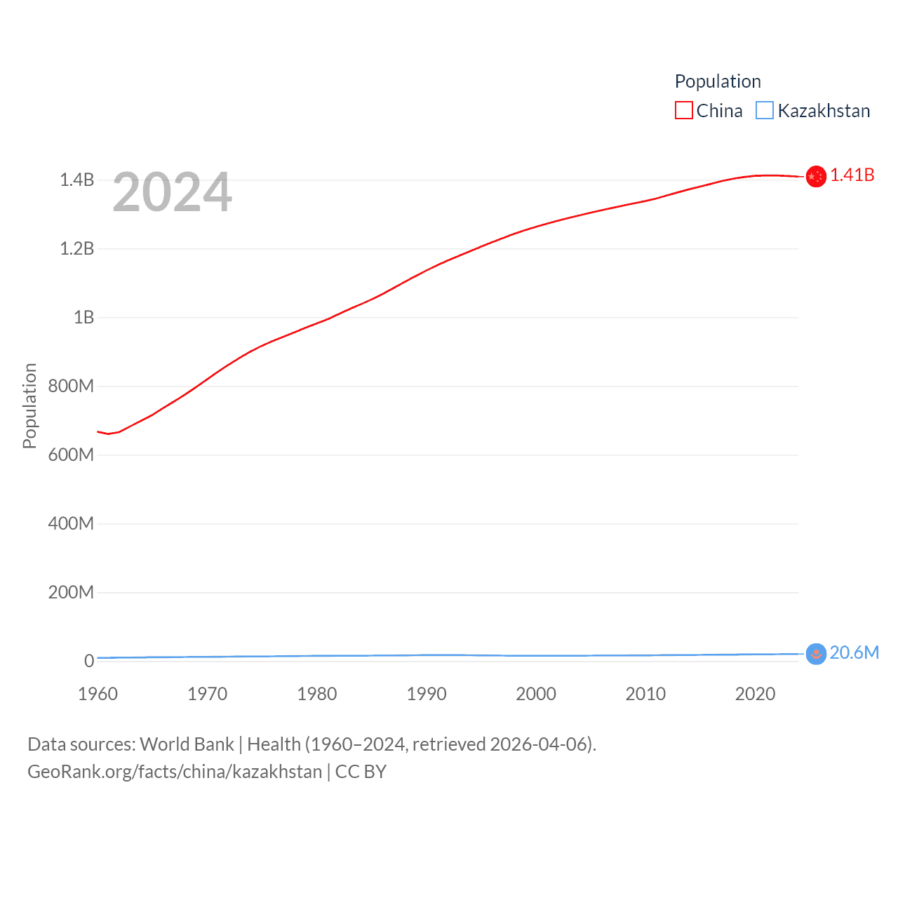 China has a population of 1.41B (ranked 2/197), compared with 20.6M in Kazakhstan (ranked 64/197). China's land area is 3,624,808 sq mi versus 1,042,360 sq mi for Kazakhstan (ranked 2nd vs. 9th).