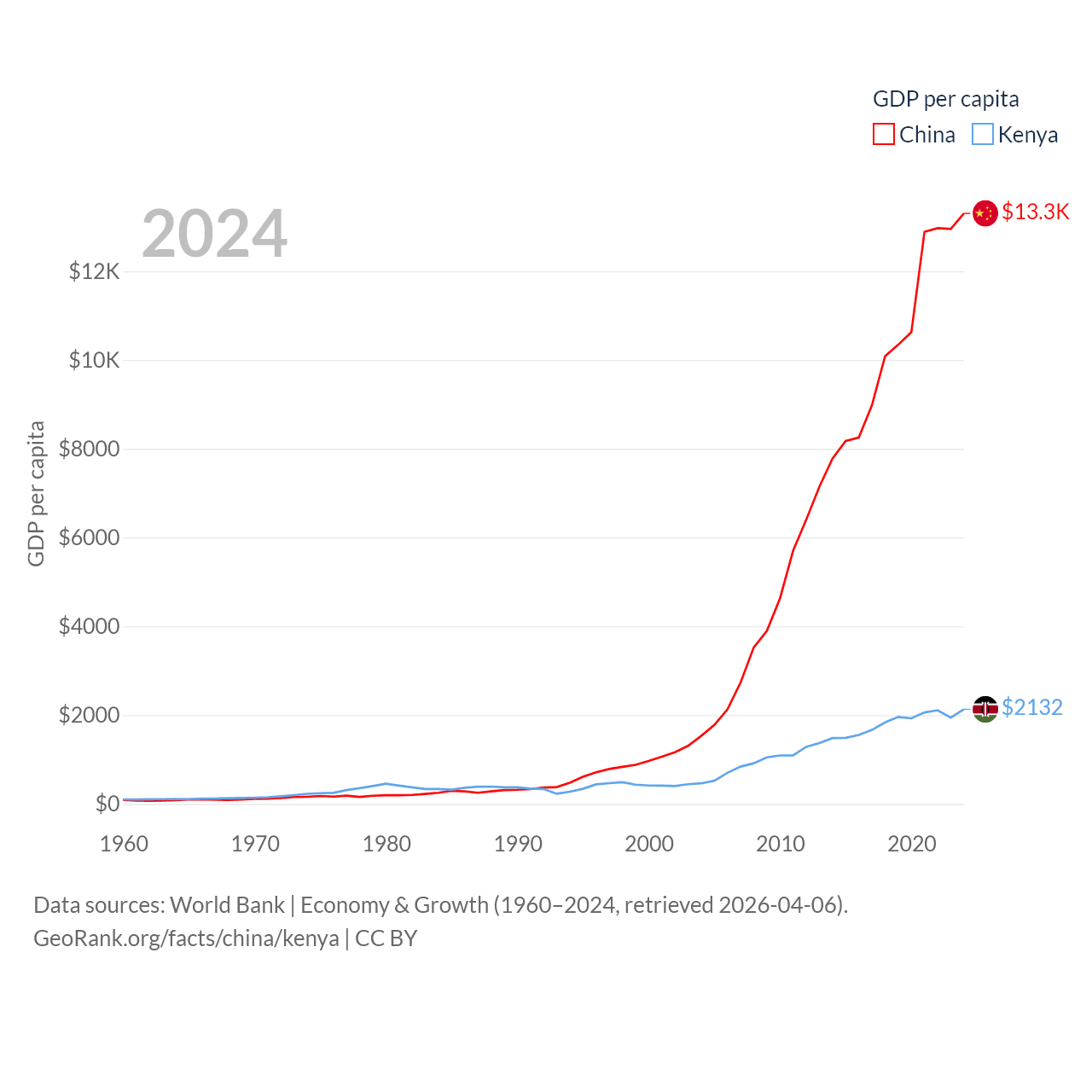 By GDP, China ranks 2/197 ($18.7T) and Kenya ranks 64/197 ($120B). By GDP per capita, China ranks 76/197 ($13,303), while Kenya ranks 154/197 ($2,132).