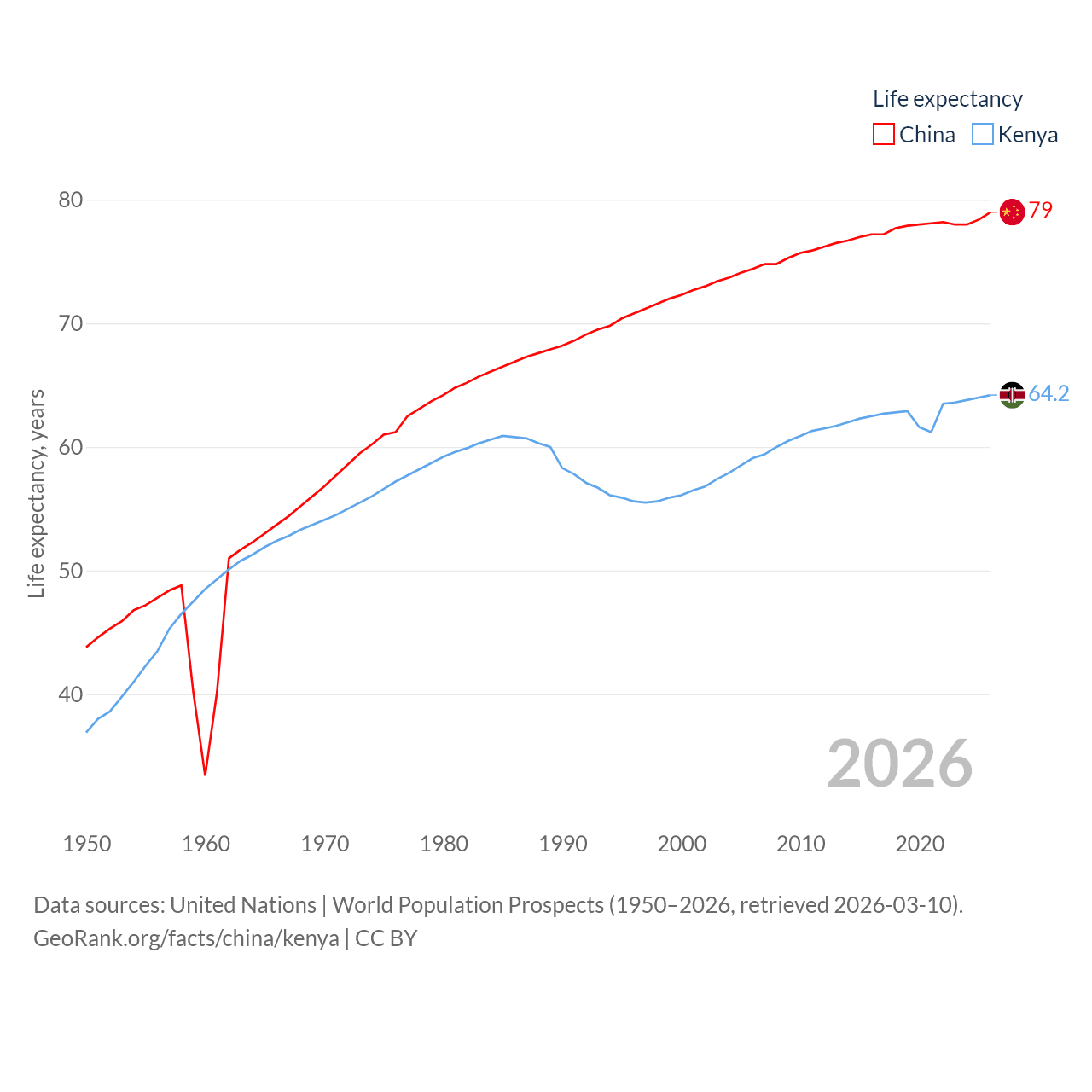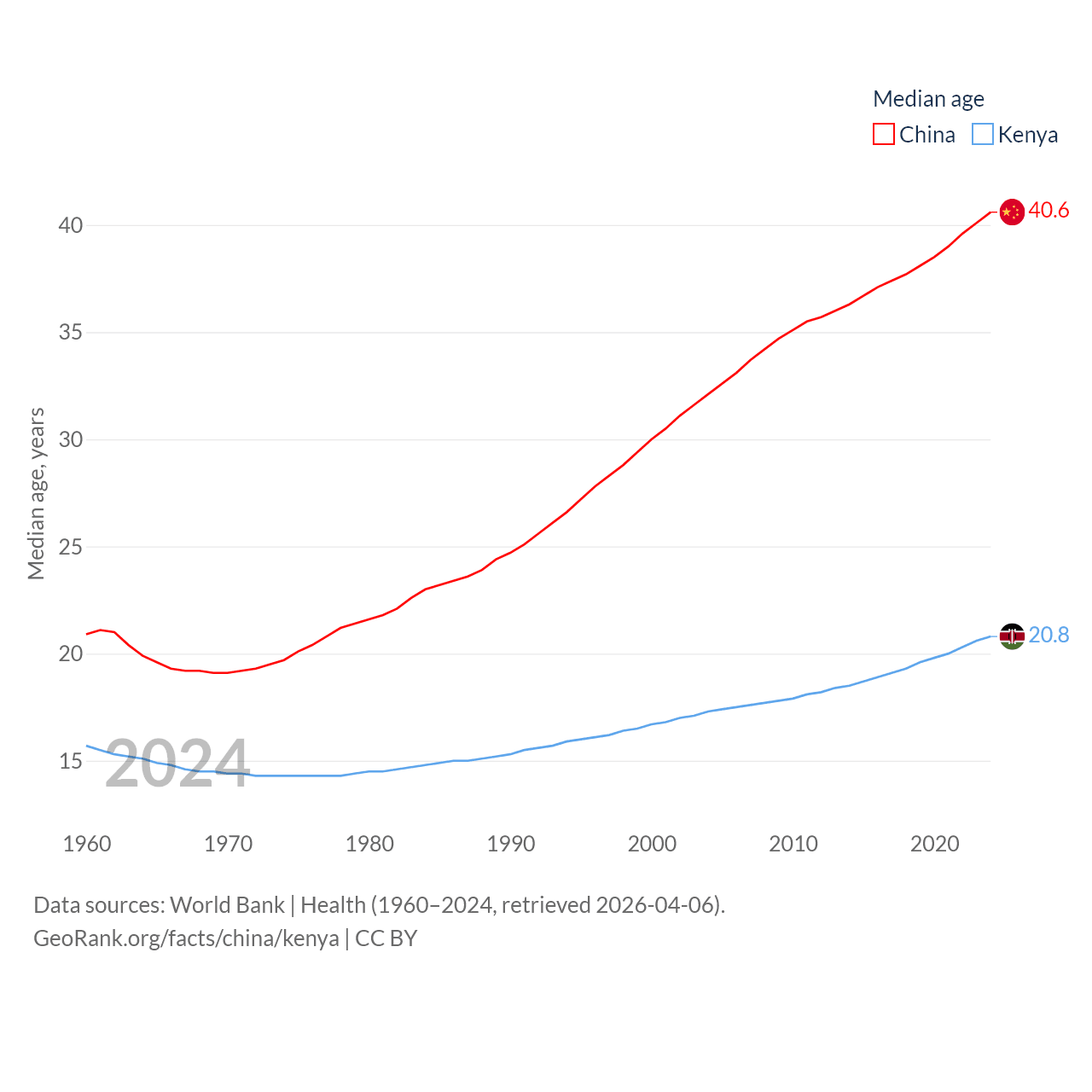 China has a population of 1.41B (ranked 2/197), compared with 56.4M in Kenya (ranked 26/197). China's land area is 3,624,808 sq mi versus 224,278 sq mi for Kenya (ranked 2nd vs. 45th).