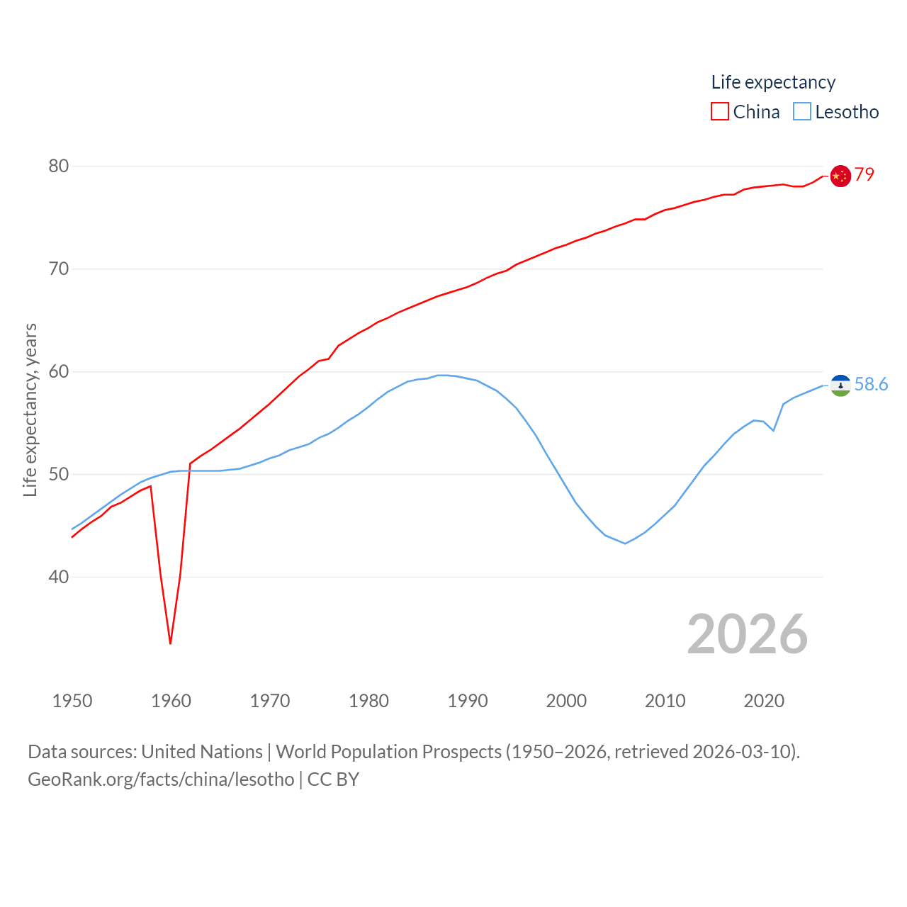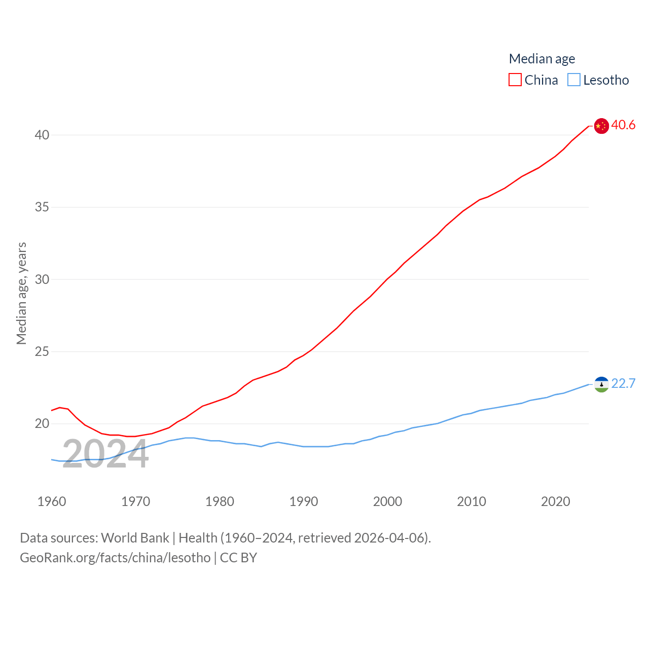 China has a population of 1.41B (ranked 2/197), compared with 2.34M in Lesotho (ranked 145/197). China's land area is 3,624,808 sq mi versus 11,722 sq mi for Lesotho (ranked 2nd vs. 137th).