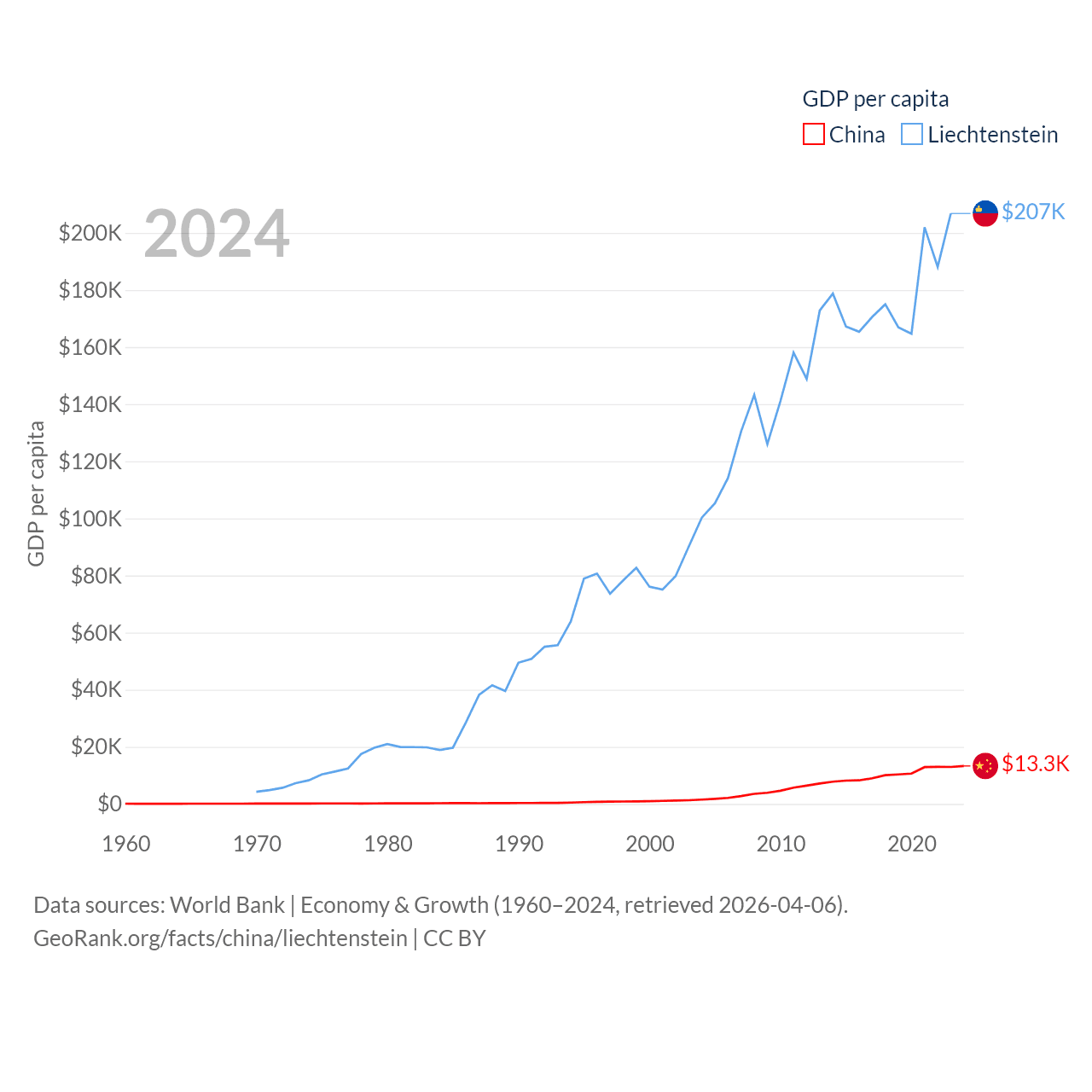 By GDP, China ranks 2/197 ($18.7T) and Liechtenstein ranks 156/197 ($8.24B). By GDP per capita, China ranks 76/197 ($13,303), while Liechtenstein ranks 2/197 ($206,781).