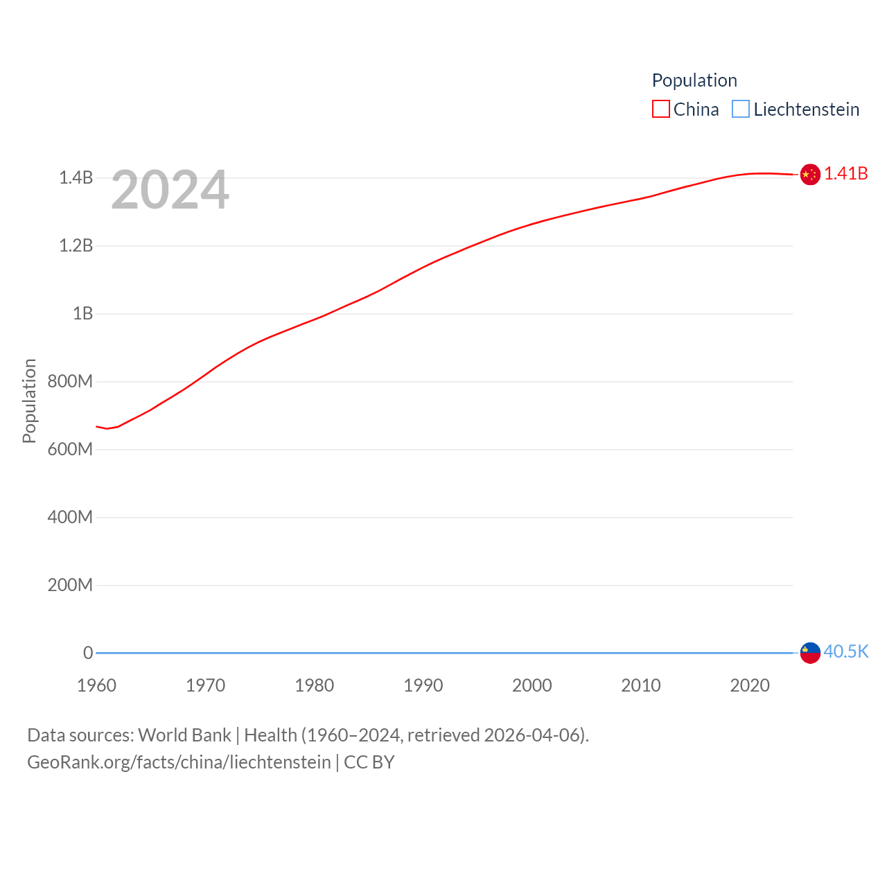 China has a population of 1.41B (ranked 2/197), compared with 40.4K in Liechtenstein (ranked 190/197). China's land area is 3,624,808 sq mi versus 61.8 sq mi for Liechtenstein (ranked 2nd vs. 192nd).