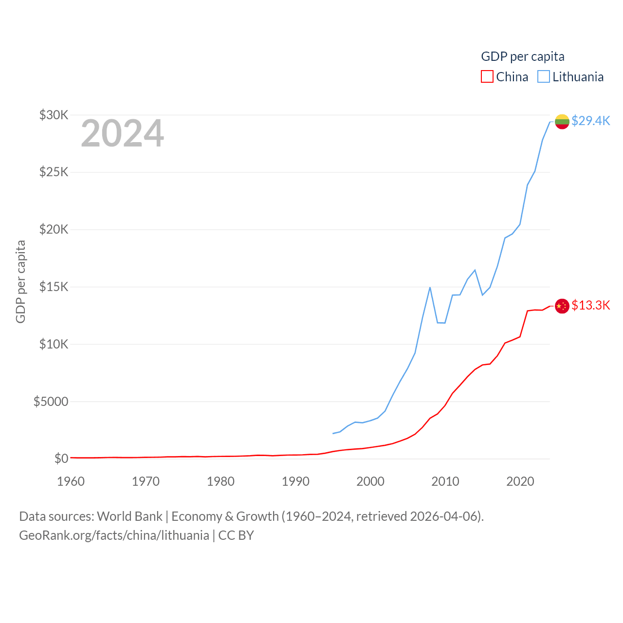 By GDP, China ranks 2/197 ($18.7T) and Lithuania ranks 79/197 ($84.9B). By GDP per capita, China ranks 76/197 ($13,303), while Lithuania ranks 43/197 ($29,384).