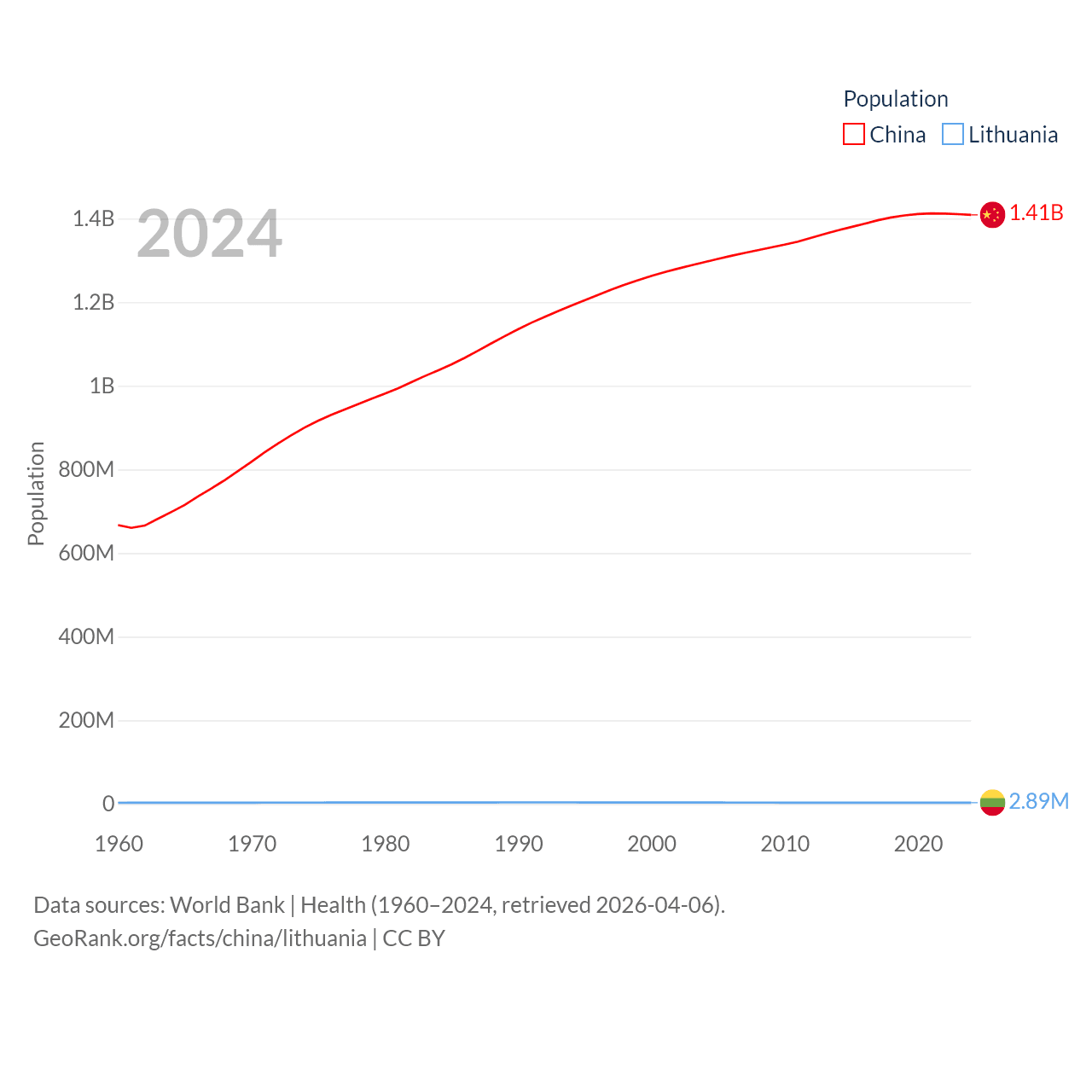 China has a population of 1.41B (ranked 2/197), compared with 2.89M in Lithuania (ranked 137/197). China's land area is 3,624,808 sq mi versus 24,170 sq mi for Lithuania (ranked 2nd vs. 120th).