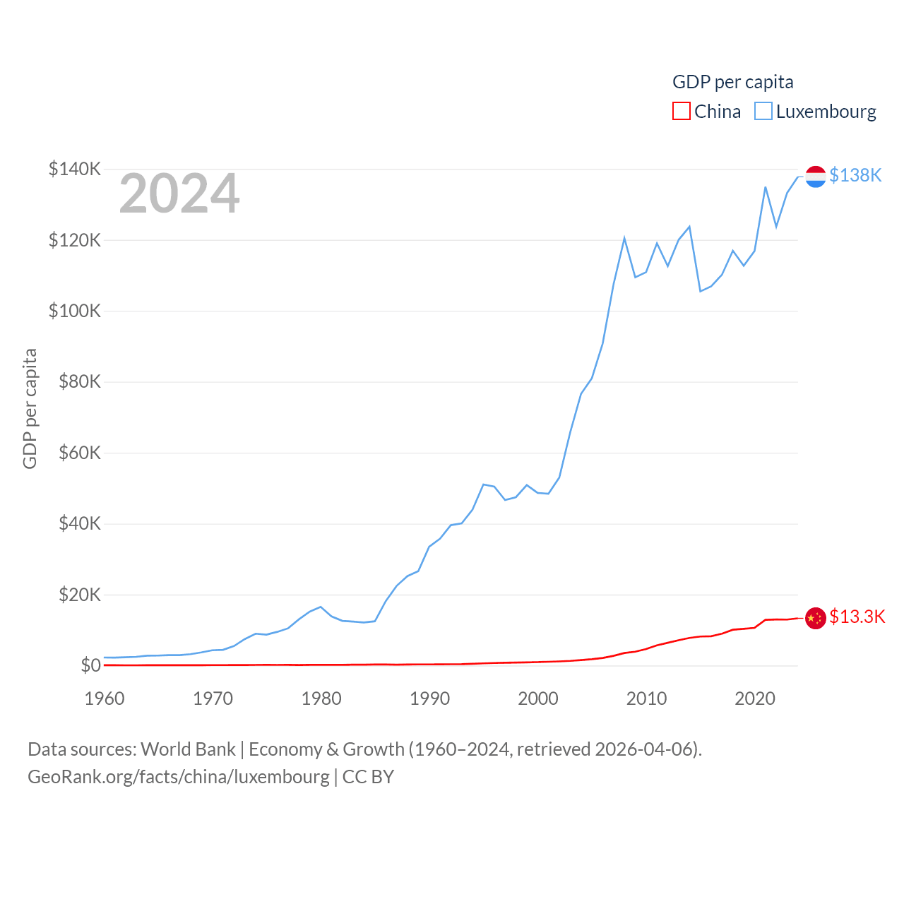By GDP, China ranks 2/197 ($18.7T) and Luxembourg ranks 74/197 ($93.3B). By GDP per capita, China ranks 76/197 ($13,303), while Luxembourg ranks 3/197 ($137,782).