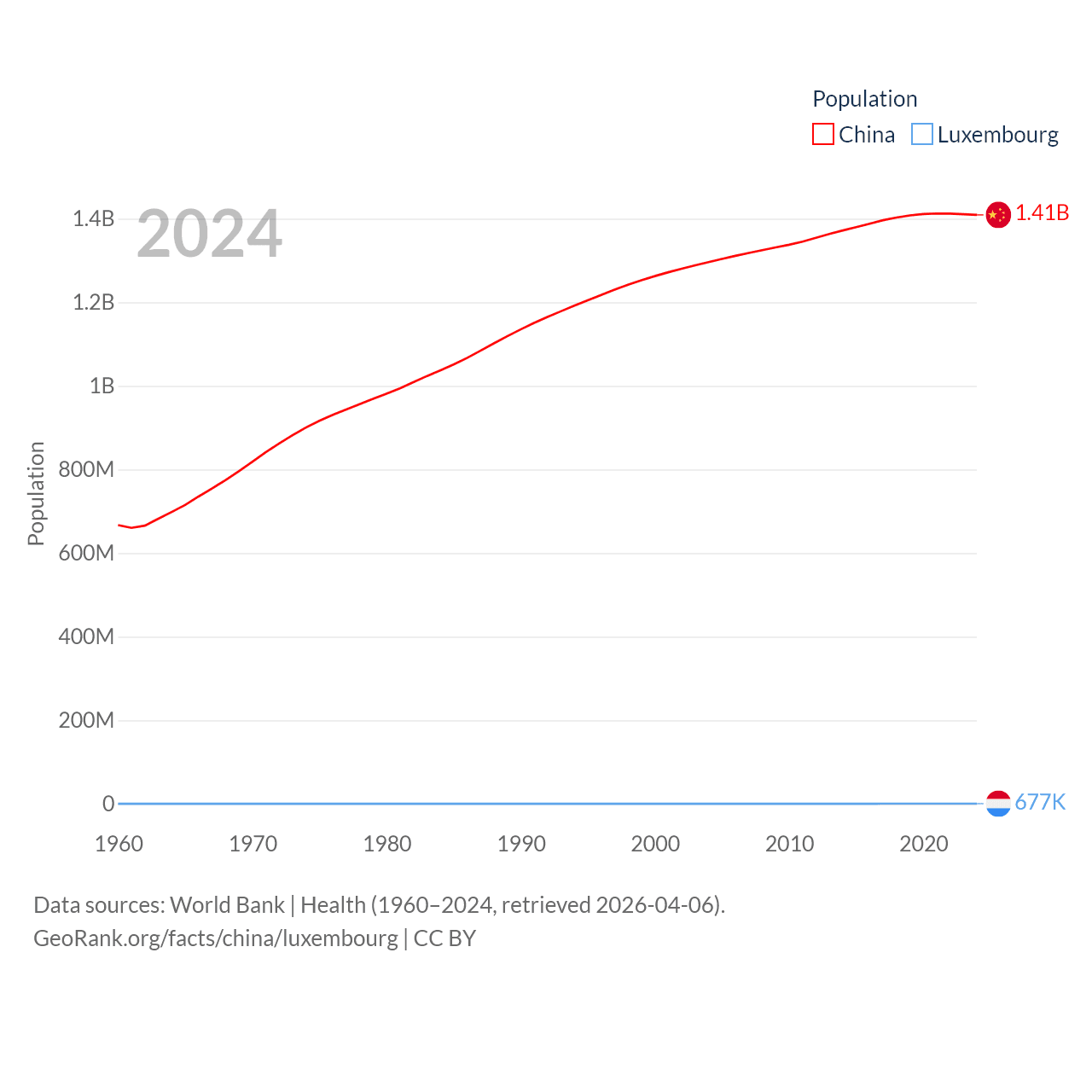 China has a population of 1.41B (ranked 2/197), compared with 677K in Luxembourg (ranked 164/197). China's land area is 3,624,808 sq mi versus 994 sq mi for Luxembourg (ranked 2nd vs. 169th).