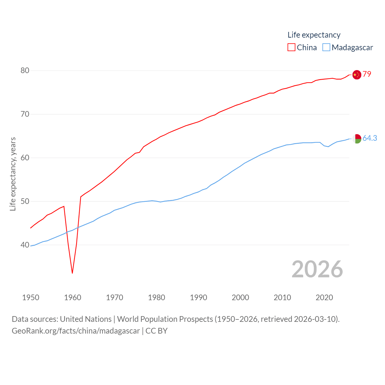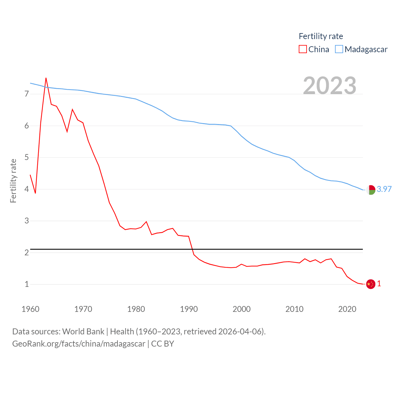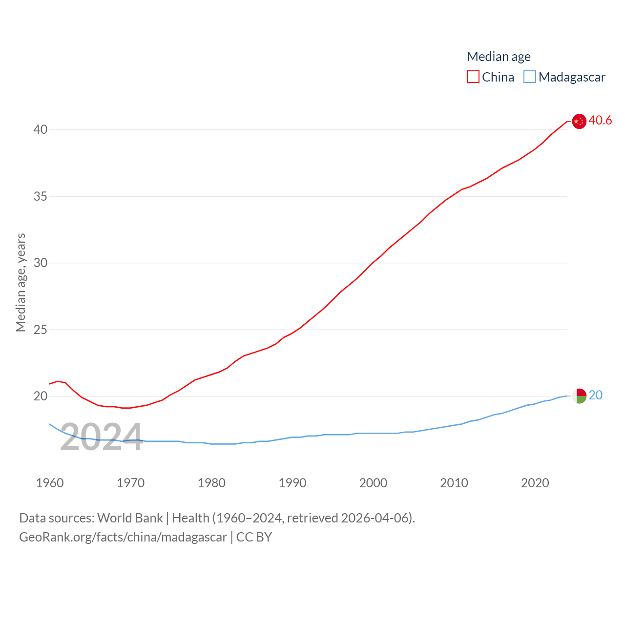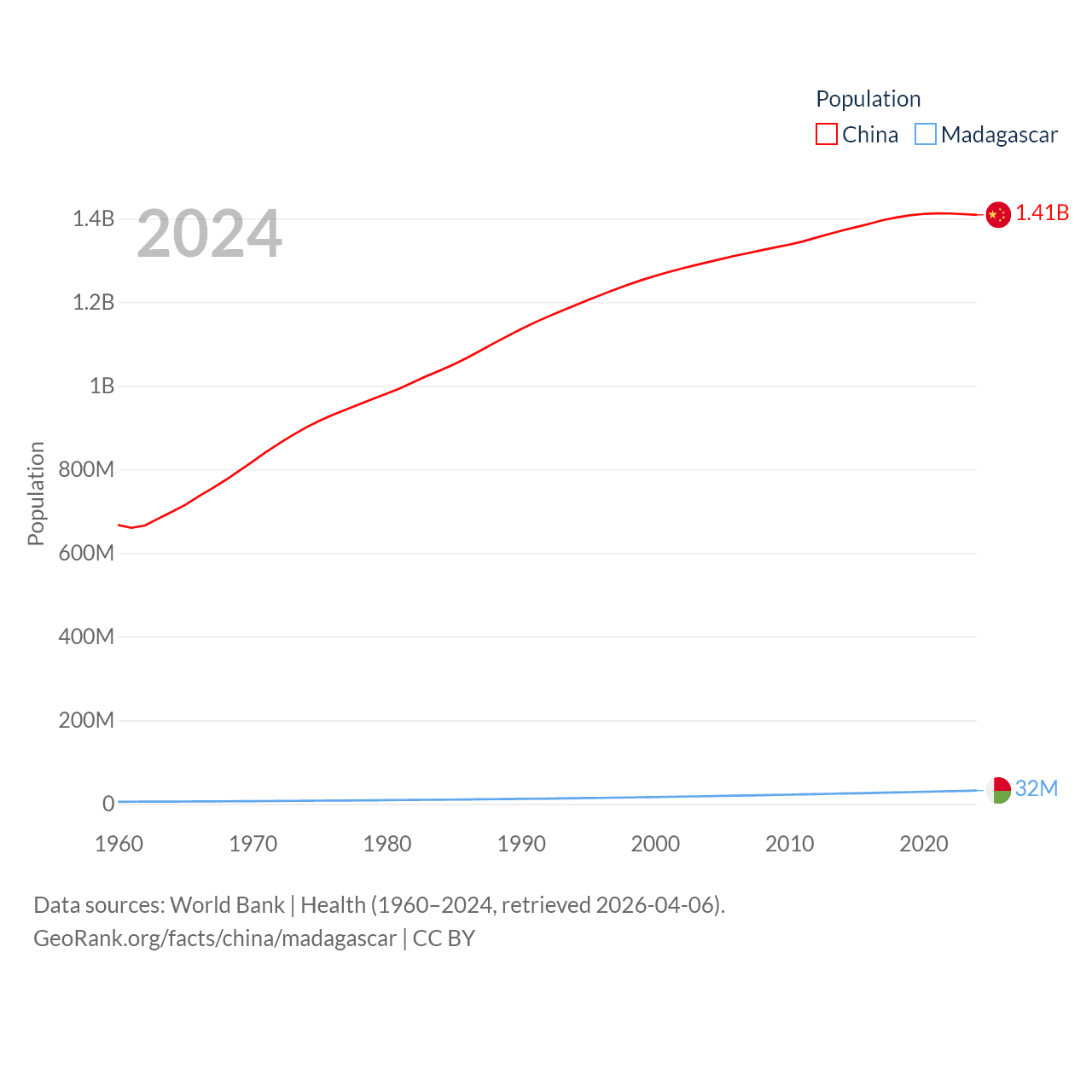 China has a population of 1.41B (ranked 2/197), compared with 32M in Madagascar (ranked 49/197). China's land area is 3,624,808 sq mi versus 224,634 sq mi for Madagascar (ranked 2nd vs. 44th).