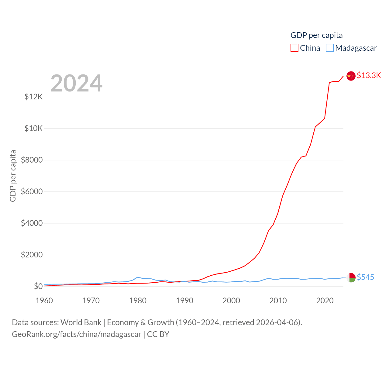 By GDP, China ranks 2/197 ($18.7T) and Madagascar ranks 136/197 ($17.4B). By GDP per capita, China ranks 76/197 ($13,303), while Madagascar ranks 193/197 ($545).