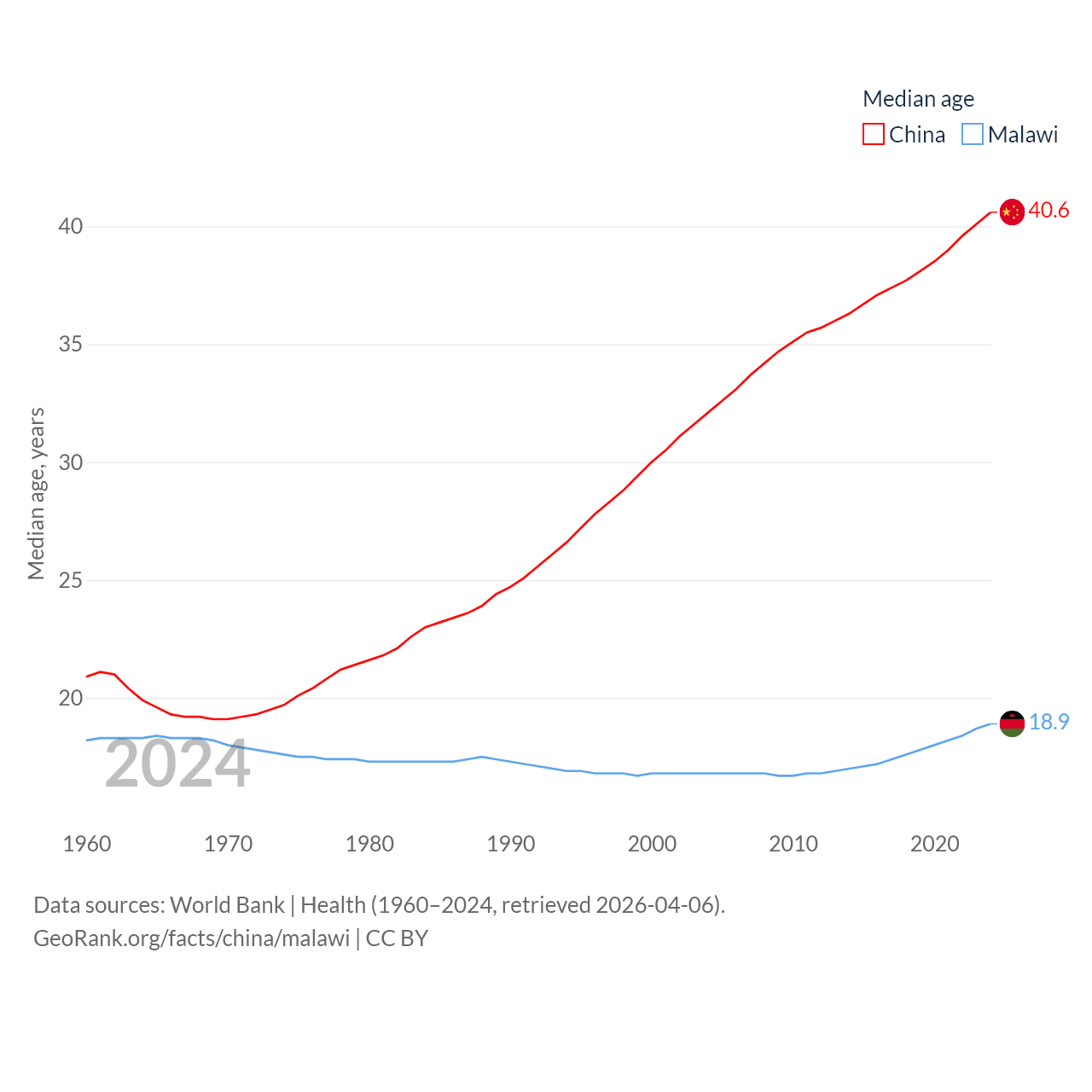 China has a population of 1.41B (ranked 2/197), compared with 21.7M in Malawi (ranked 62/197). China's land area is 3,624,808 sq mi versus 36,402 sq mi for Malawi (ranked 2nd vs. 107th).