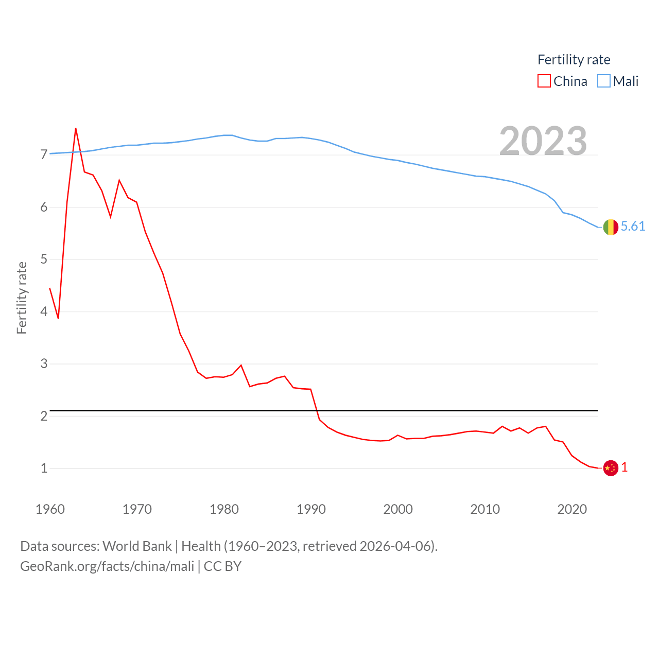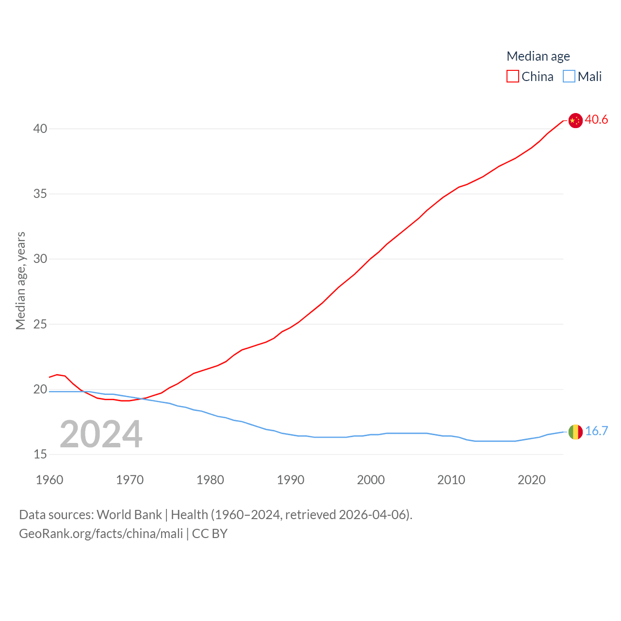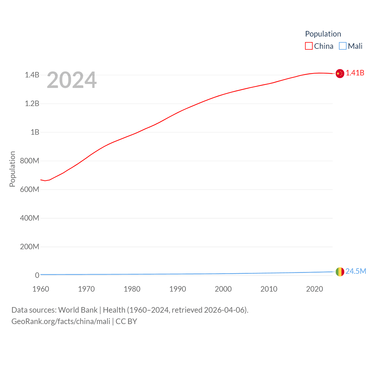 China has a population of 1.41B (ranked 2/197), compared with 24.5M in Mali (ranked 58/197). China's land area is 3,624,808 sq mi versus 471,118 sq mi for Mali (ranked 2nd vs. 23rd).