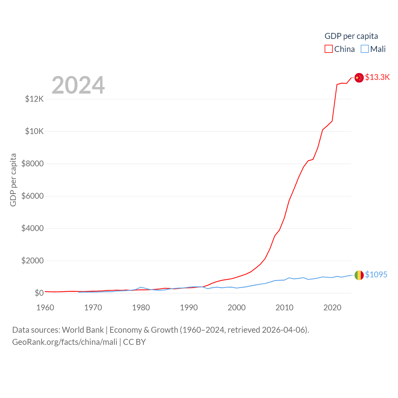 By GDP, China ranks 2/197 ($18.7T) and Mali ranks 113/197 ($26.8B). By GDP per capita, China ranks 76/197 ($13,303), while Mali ranks 173/197 ($1,095).