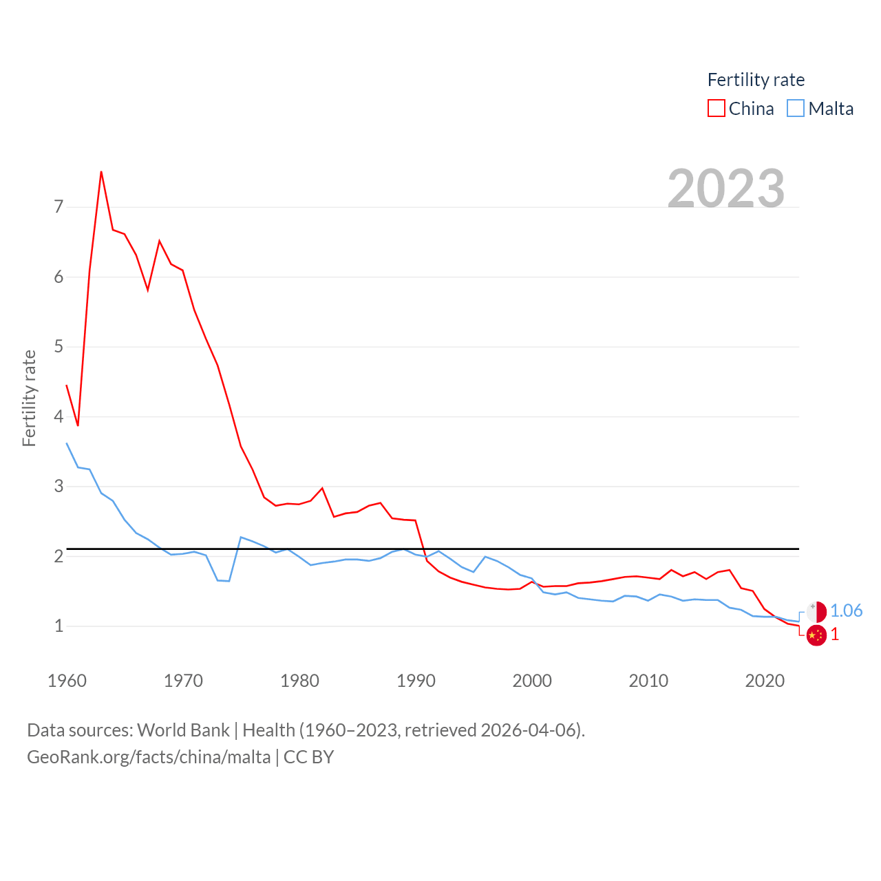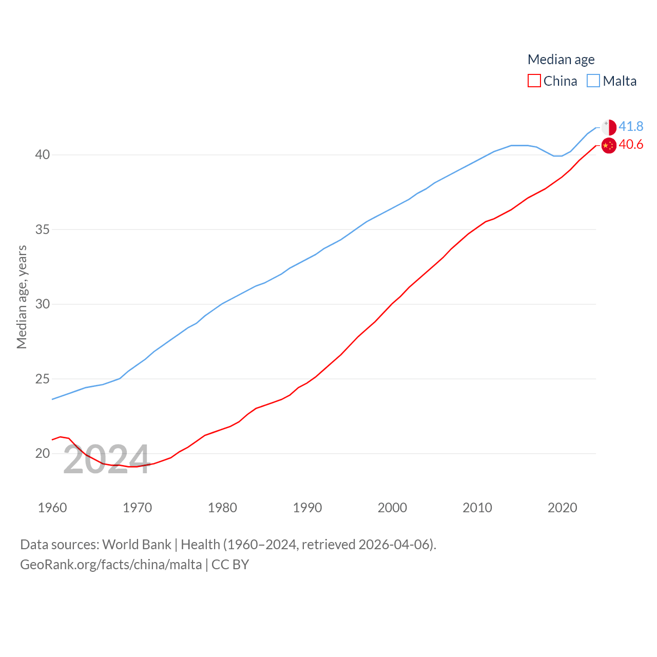China has a population of 1.41B (ranked 2/197), compared with 569K in Malta (ranked 167/197). China's land area is 3,624,808 sq mi versus 123.6 sq mi for Malta (ranked 2nd vs. 187th).