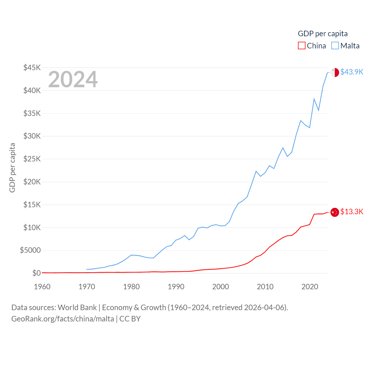 By GDP, China ranks 2/197 ($18.7T) and Malta ranks 119/197 ($25B). By GDP per capita, China ranks 76/197 ($13,303), while Malta ranks 28/197 ($43,899).