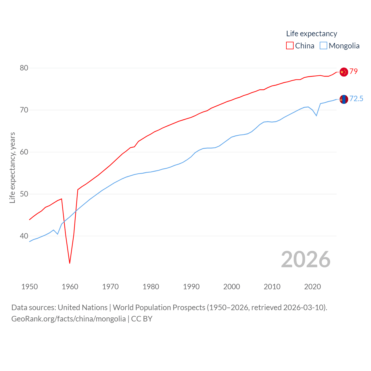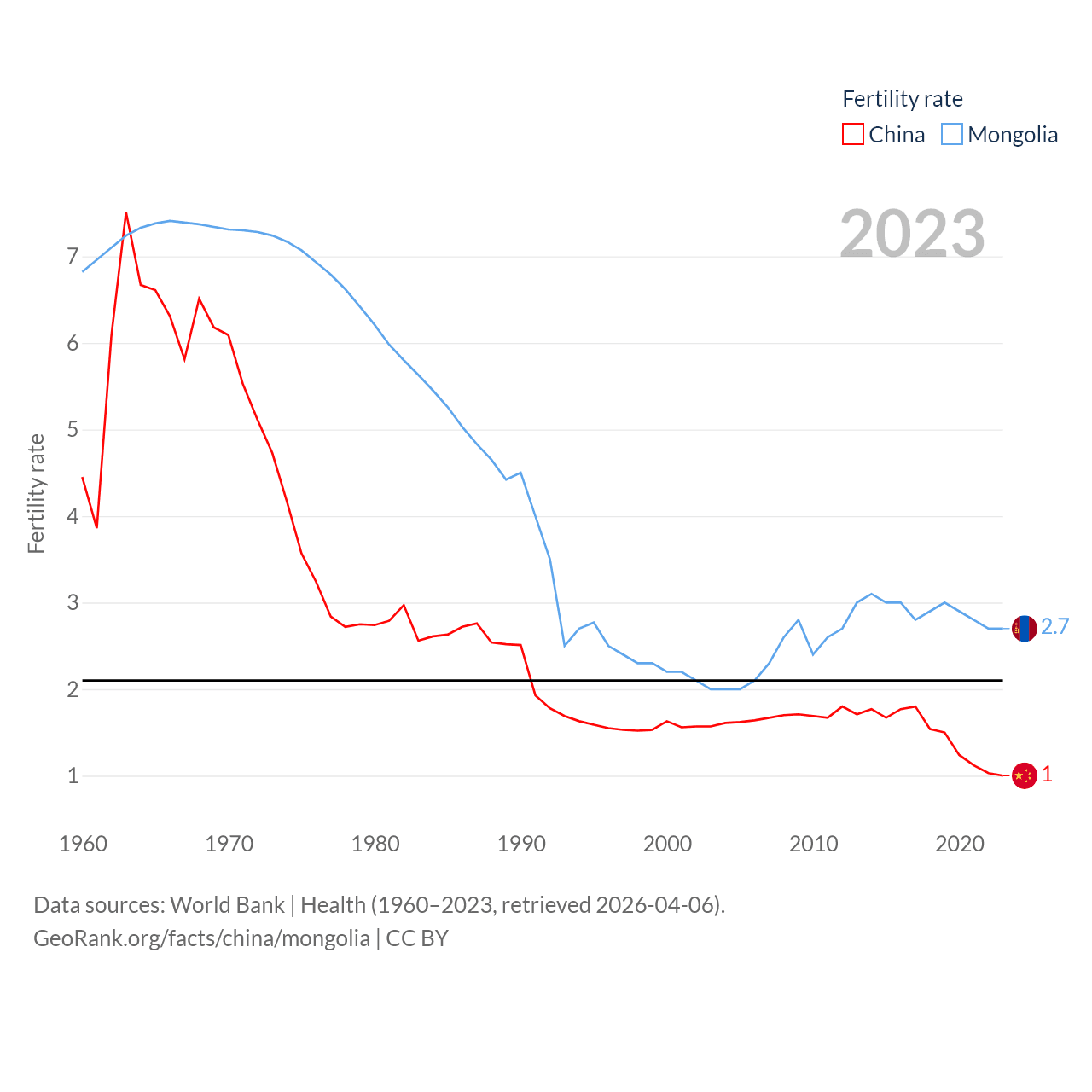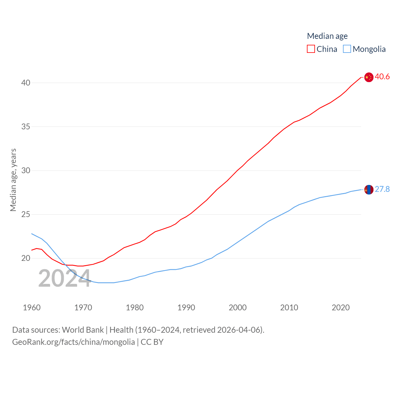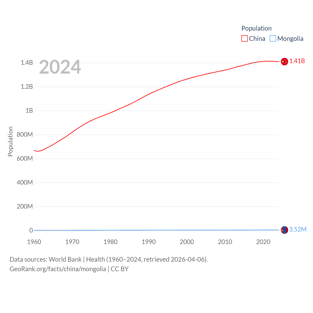 China has a population of 1.41B (ranked 2/197), compared with 3.52M in Mongolia (ranked 132/197). China's land area is 3,624,808 sq mi versus 601,740 sq mi for Mongolia (ranked 2nd vs. 18th).