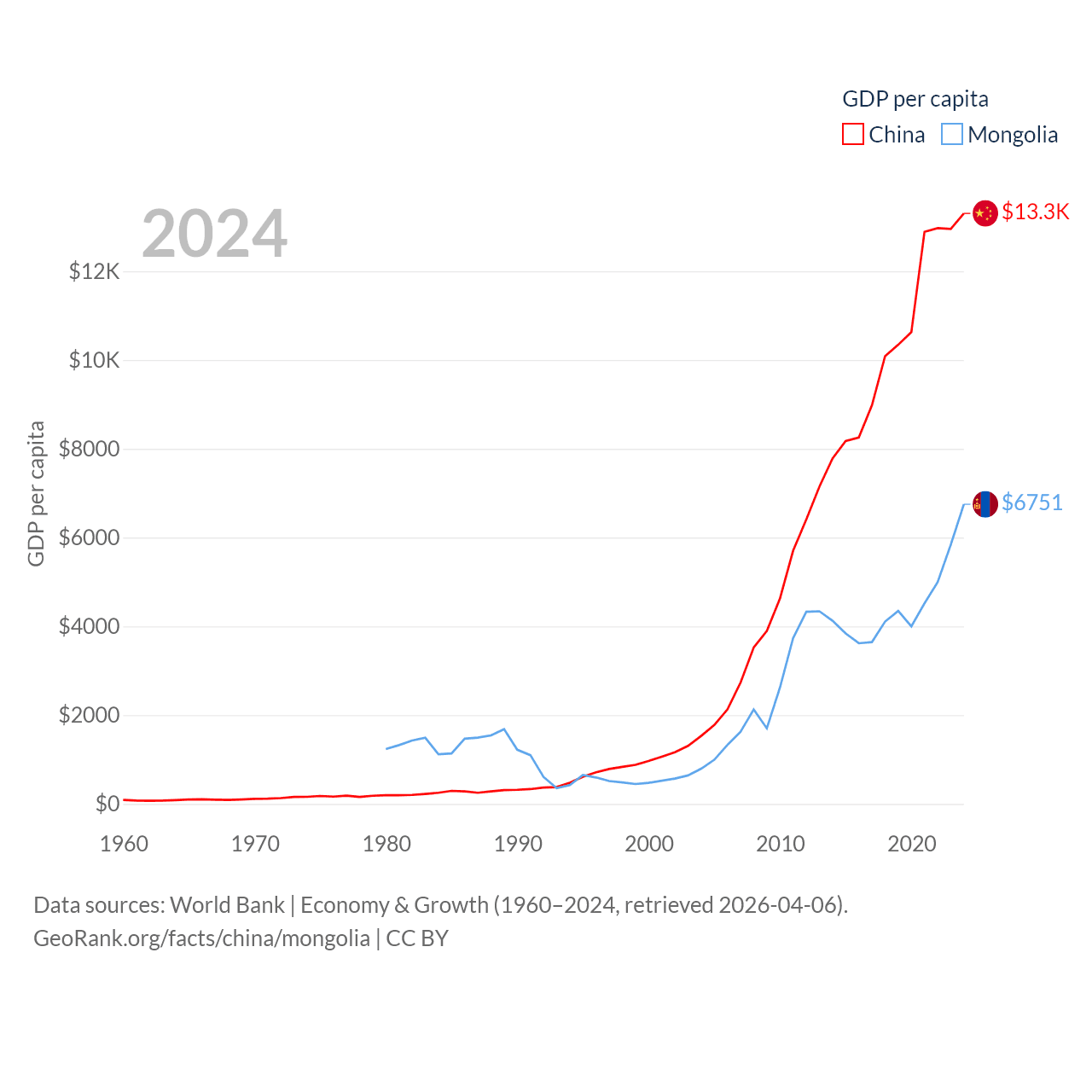 By GDP, China ranks 2/197 ($18.7T) and Mongolia ranks 121/197 ($23.8B). By GDP per capita, China ranks 76/197 ($13,303), while Mongolia ranks 105/197 ($6,751).