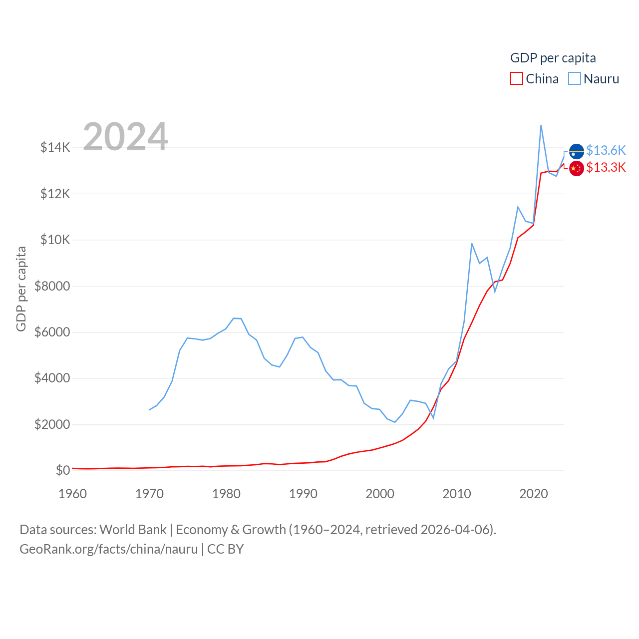 By GDP, China ranks 2/197 ($18.7T) and Nauru ranks 195/197 ($163M). By GDP per capita, China ranks 76/197 ($13,303), while Nauru ranks 74/197 ($13,609).