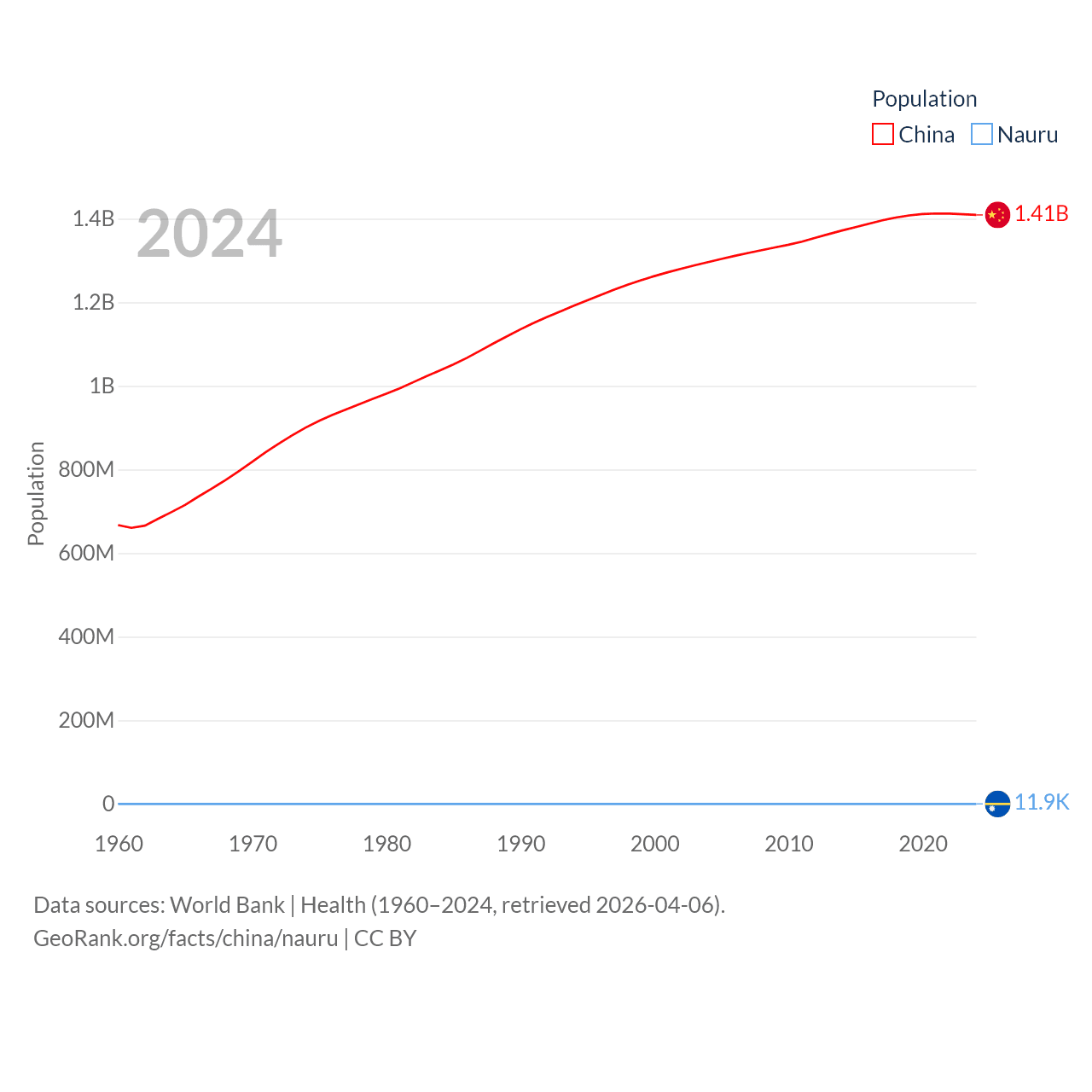 China has a population of 1.41B (ranked 2/197), compared with 11.9K in Nauru (ranked 195/197). China's land area is 3,624,808 sq mi versus 7.72 sq mi for Nauru (ranked 2nd vs. 195th).