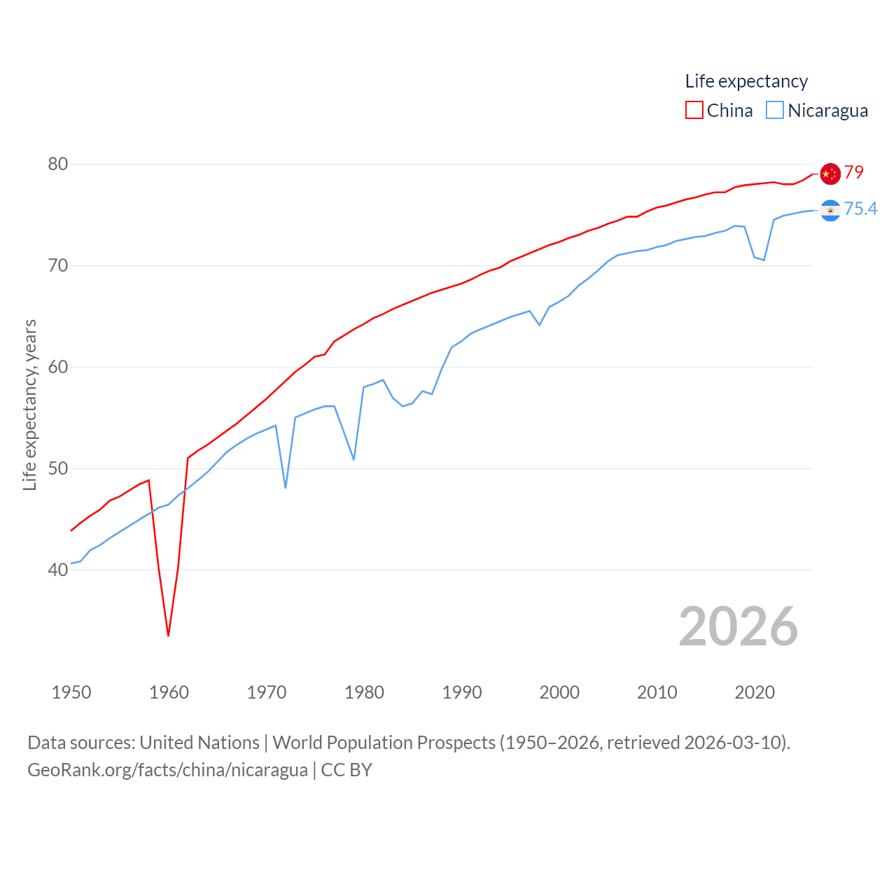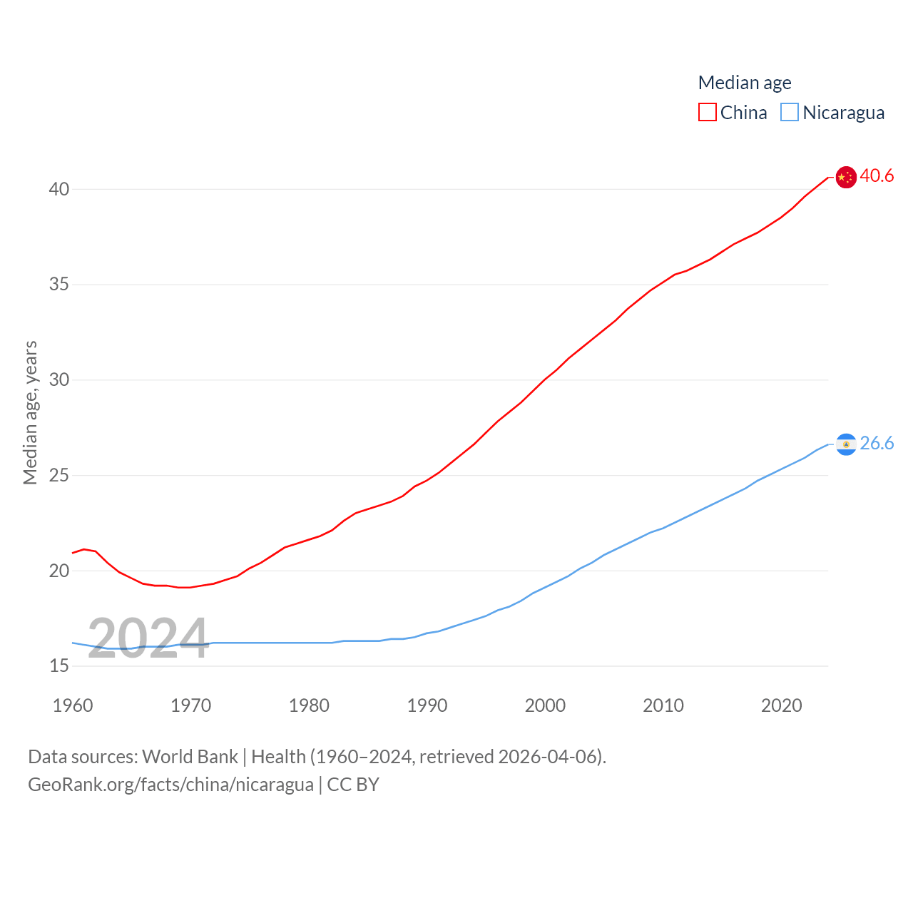 China has a population of 1.41B (ranked 2/197), compared with 6.92M in Nicaragua (ranked 108/197). China's land area is 3,624,808 sq mi versus 46,464 sq mi for Nicaragua (ranked 2nd vs. 98th).