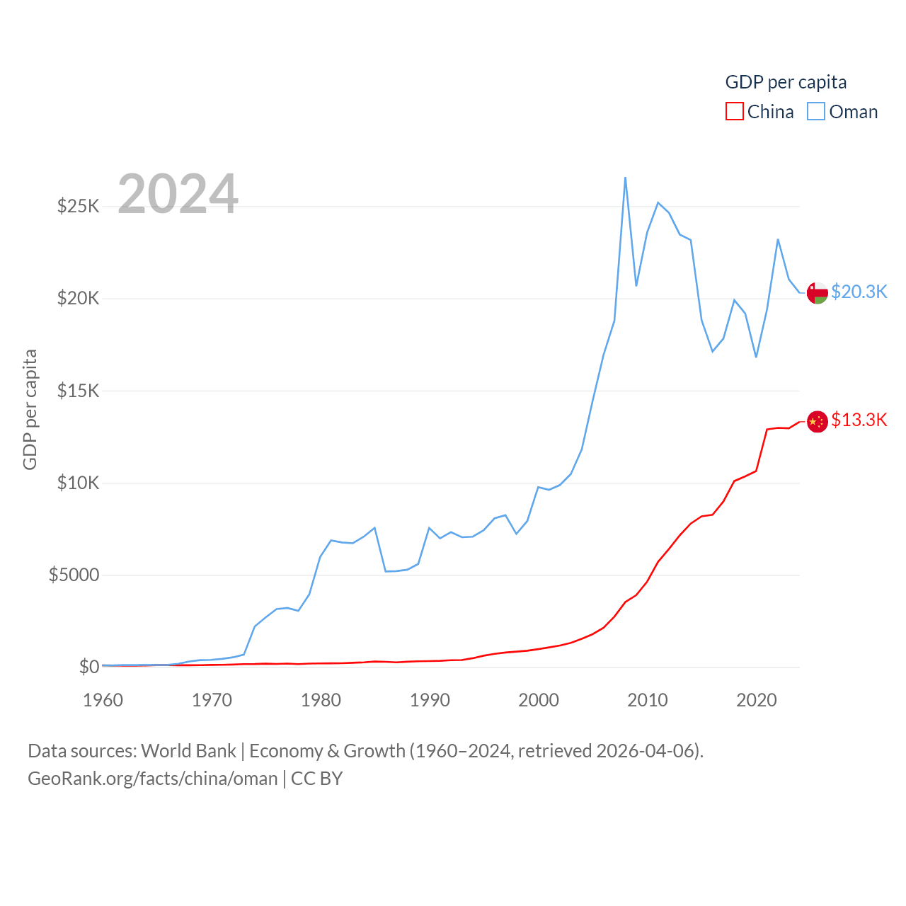 By GDP, China ranks 2/197 ($18.7T) and Oman ranks 70/197 ($107B). By GDP per capita, China ranks 76/197 ($13,303), while Oman ranks 57/197 ($20,285).